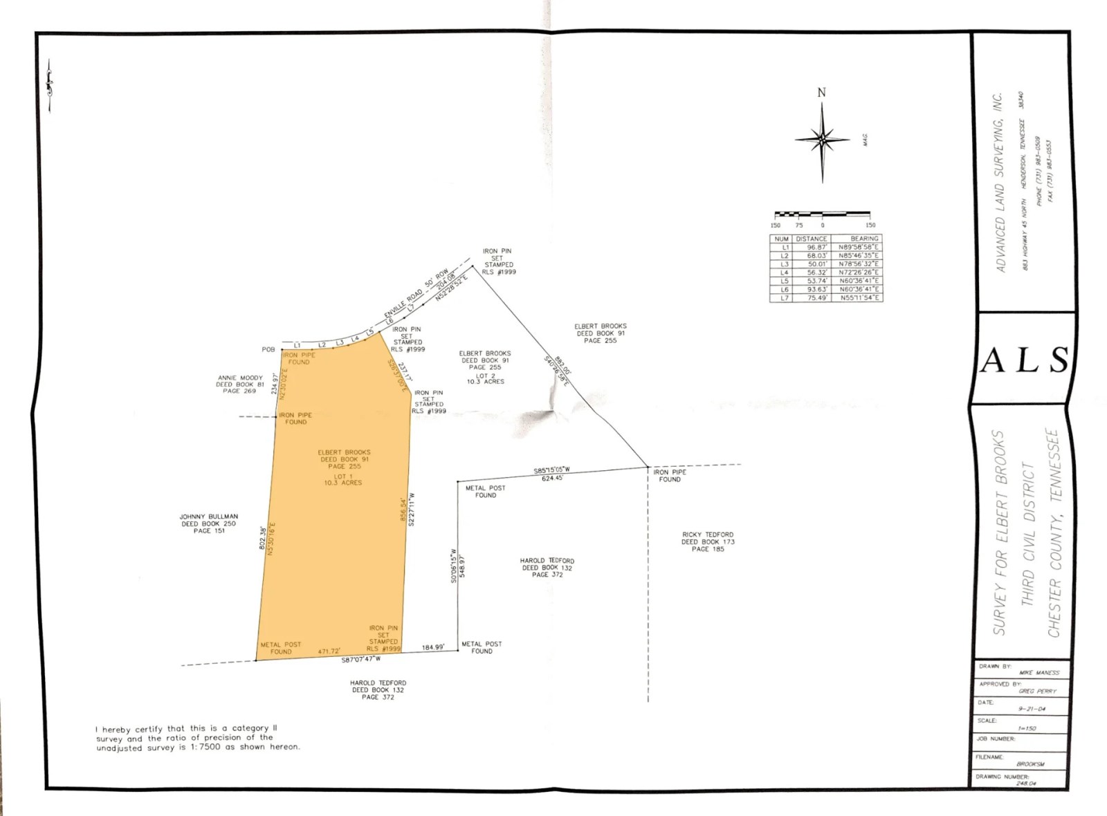 Legal Description: 10.3 acres as surveyed by Advanced Land Surveying, Inc. R.L.S. 1999 on September 21, 2004