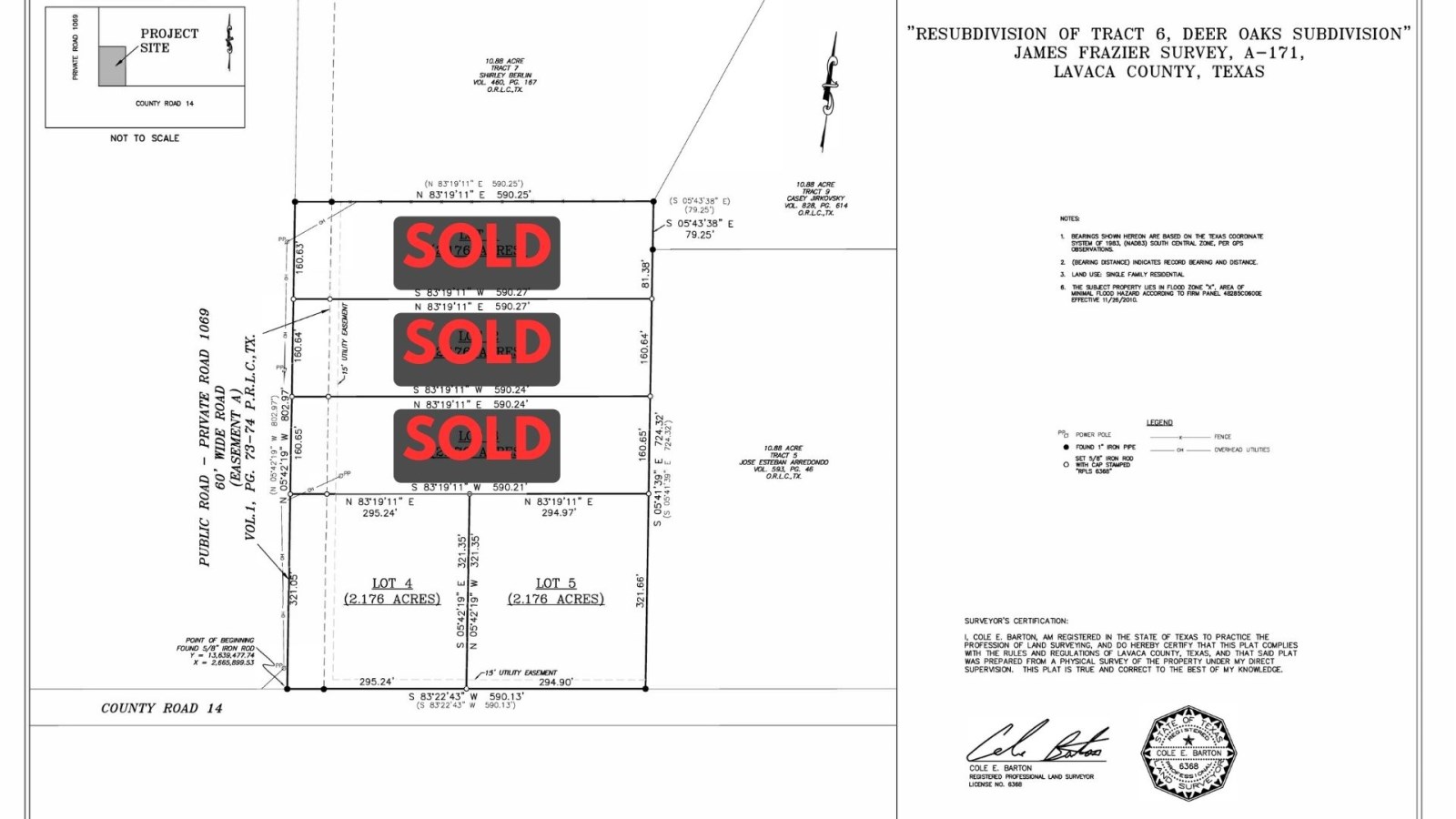 Five new properties have just been approved for Subdivision in Lavaca County. Each new lot is now flagged, boundary-staked and publicly recorded for the first time.