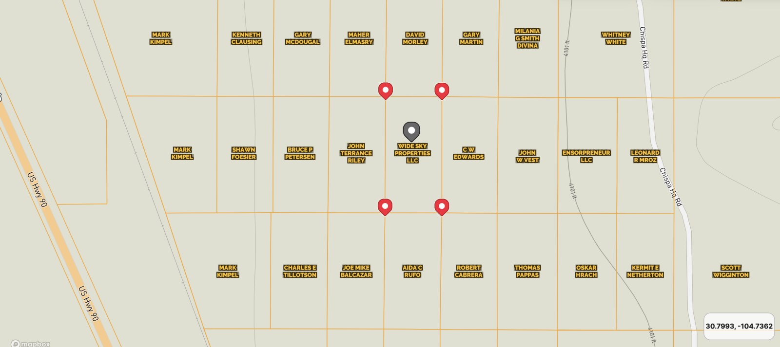 GPS Coordinates (4 corners): 30.800105,-104.738124
