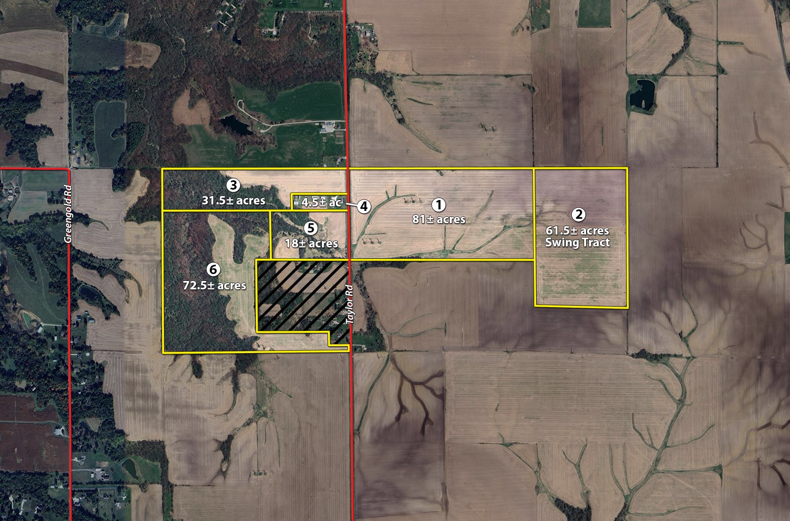Tract 5: 18± ac offering scenic settings, quality farmland, & some wooded land. This property has numerous potential uses & has a quality stand of beans on it.