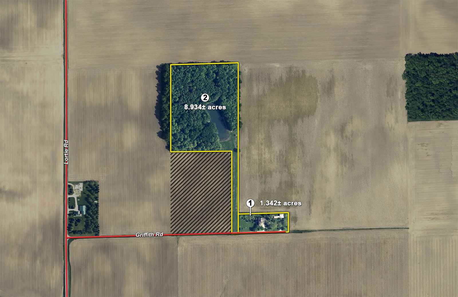 Tract 2: 8.9± ac of wooded recreational land with a pond (depth of pond and fish species, if any, unknown). Includes an owned 50' lane off Griffith Rd. back to the woods and pond. The Johnson Branch 2 drain runs through the Northeast portion of this tract with a 75' statutory drainage right-of-entry on both sides of the drain. This tract offers excellent building site potential with a superior secluded location and maximum privacy (no soil testing has been done). The tract offers an abundance of dense mature trees with possible timber value. 2024 payable 2025 taxes are $103.08.