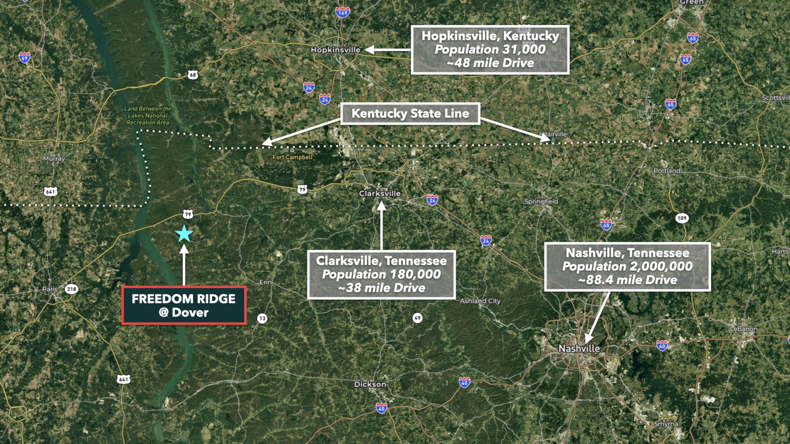Nashville, the State Capital and Largest City in Tennessee, is 88 miles from Freedom Ridge Dover. Nashville and the surrounding metropolitan area have a population of more than 2,000,000.