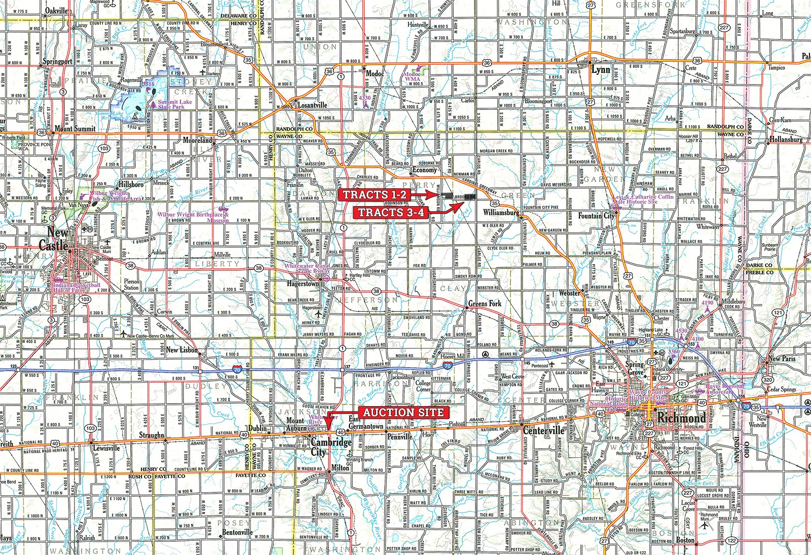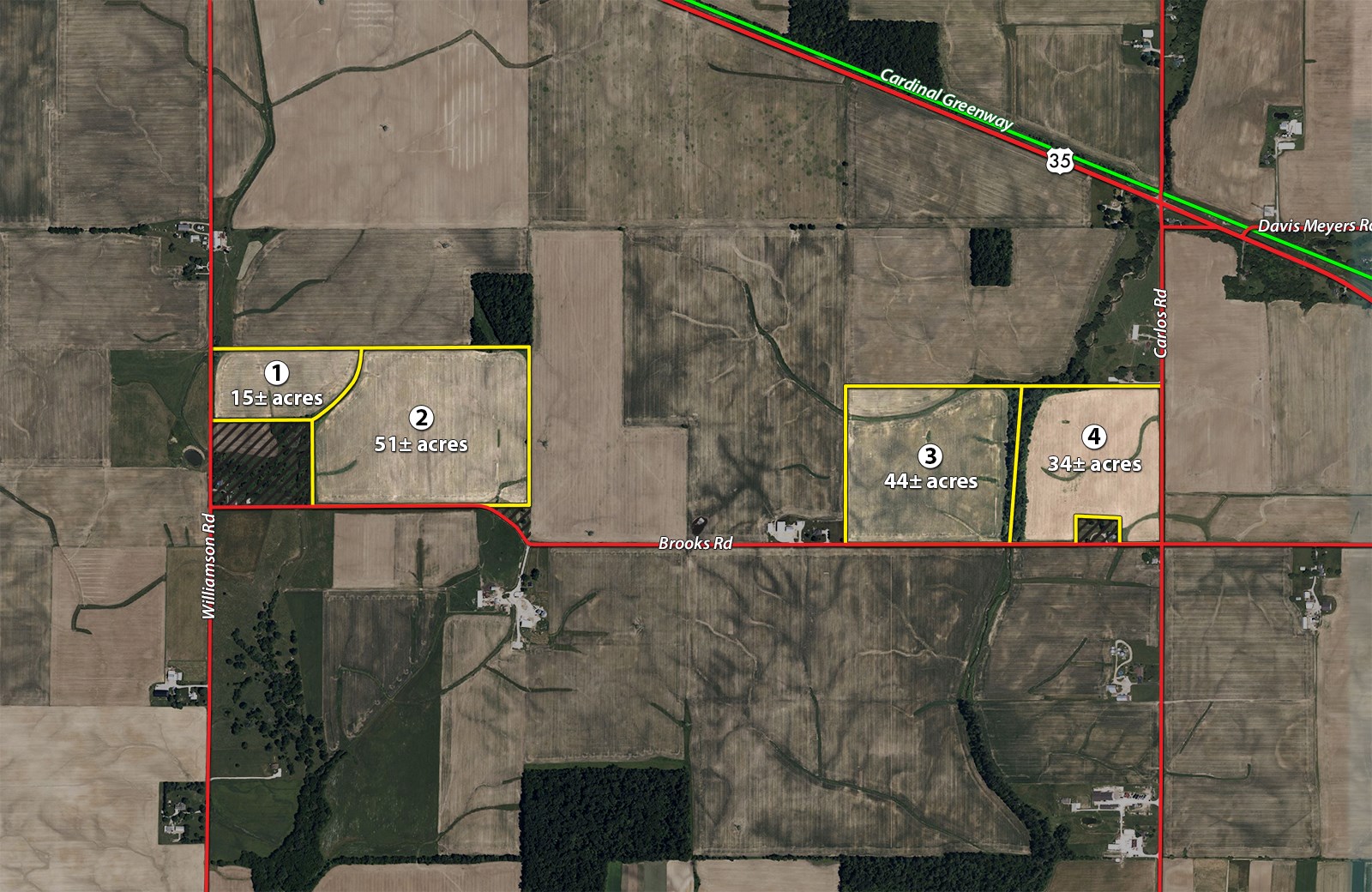 Tract 3: 44± ac with 40+/- acres cropland and 4+/- acres woodland along stream. Strawn, Crosby and Treaty soils. Corn Index 135 Bu. Good frontage on Brooks Rd.