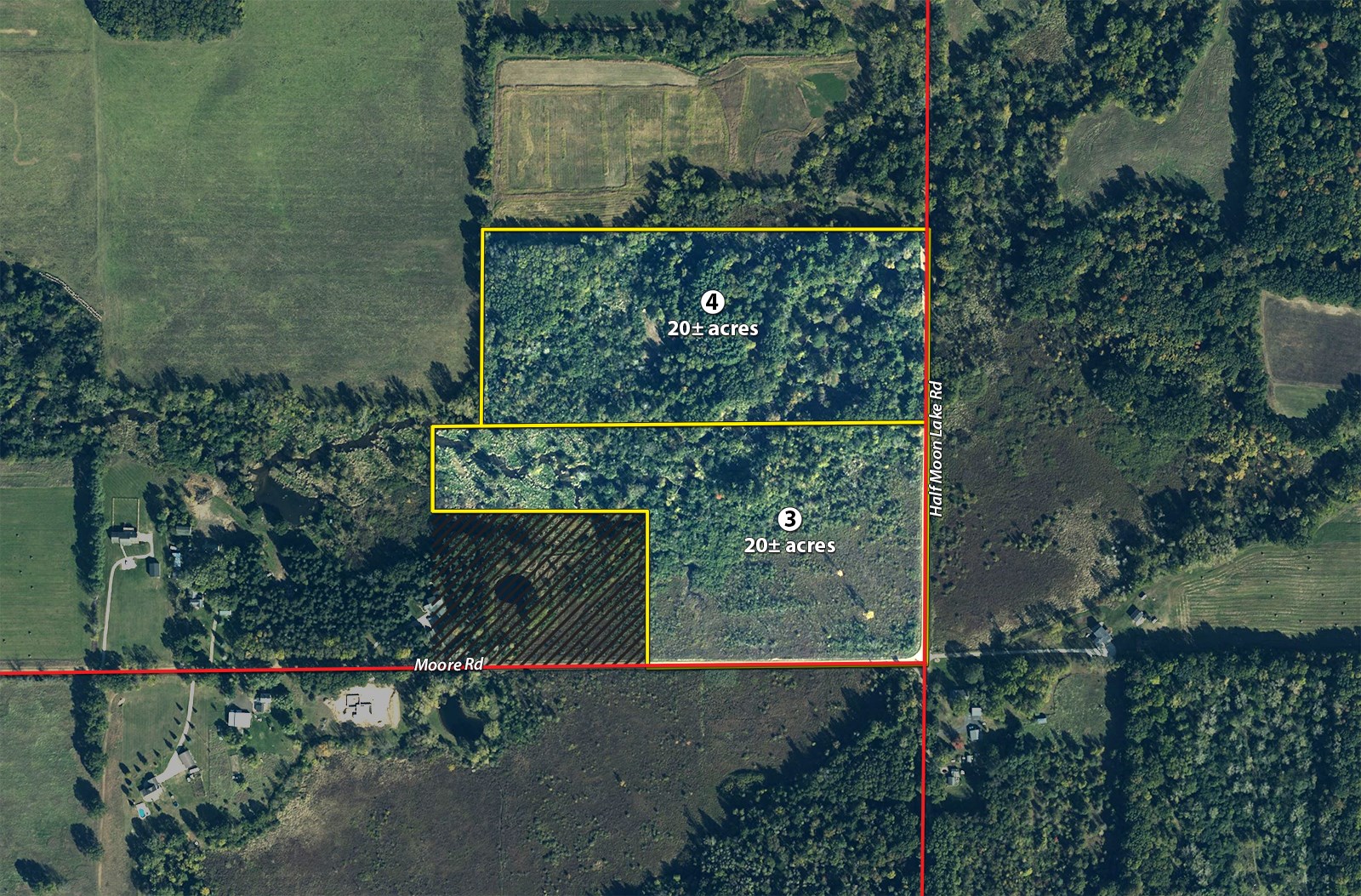 Tract 3: 20± ac with road frontage along Moore Rd and Half Moon Lake Rd. This tract offers exceptional Hillsdale county hunting. Lowland mixed with thick cover provides perfect habitat for your next big buck. Plenty of deer trails and sign throughout, just in time for hunting season. Beebe creek offers scenic views and diversity along the Northwest corner of this tract. Raised hunting blind included on this tract.