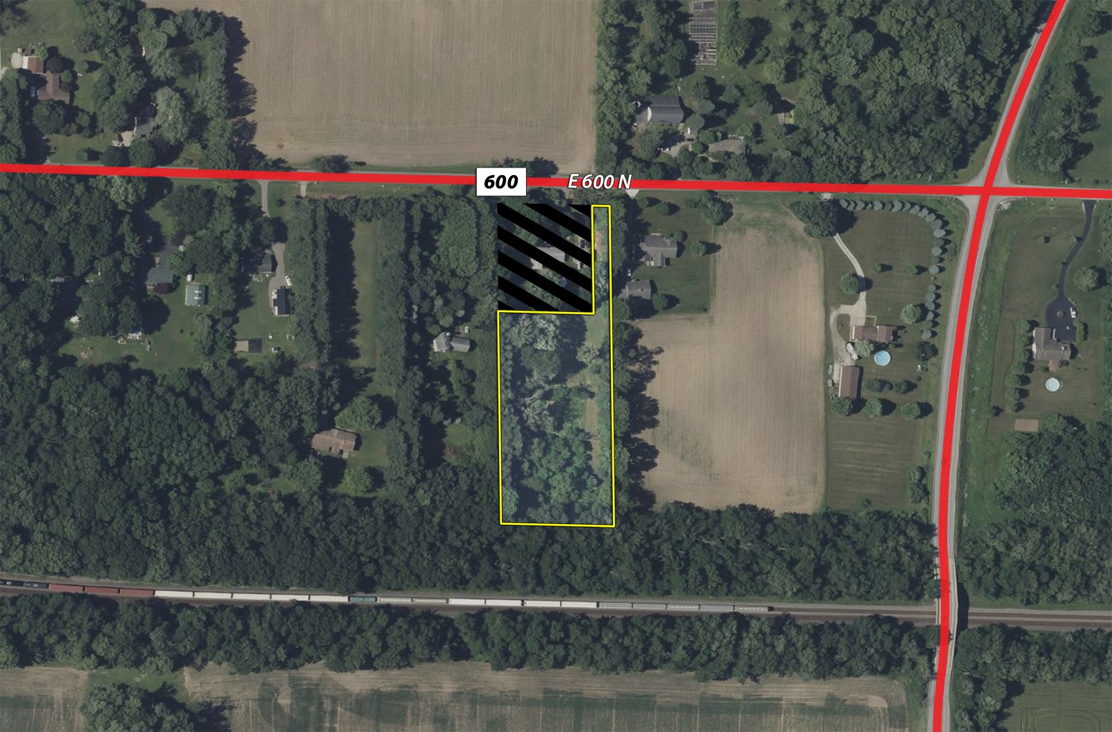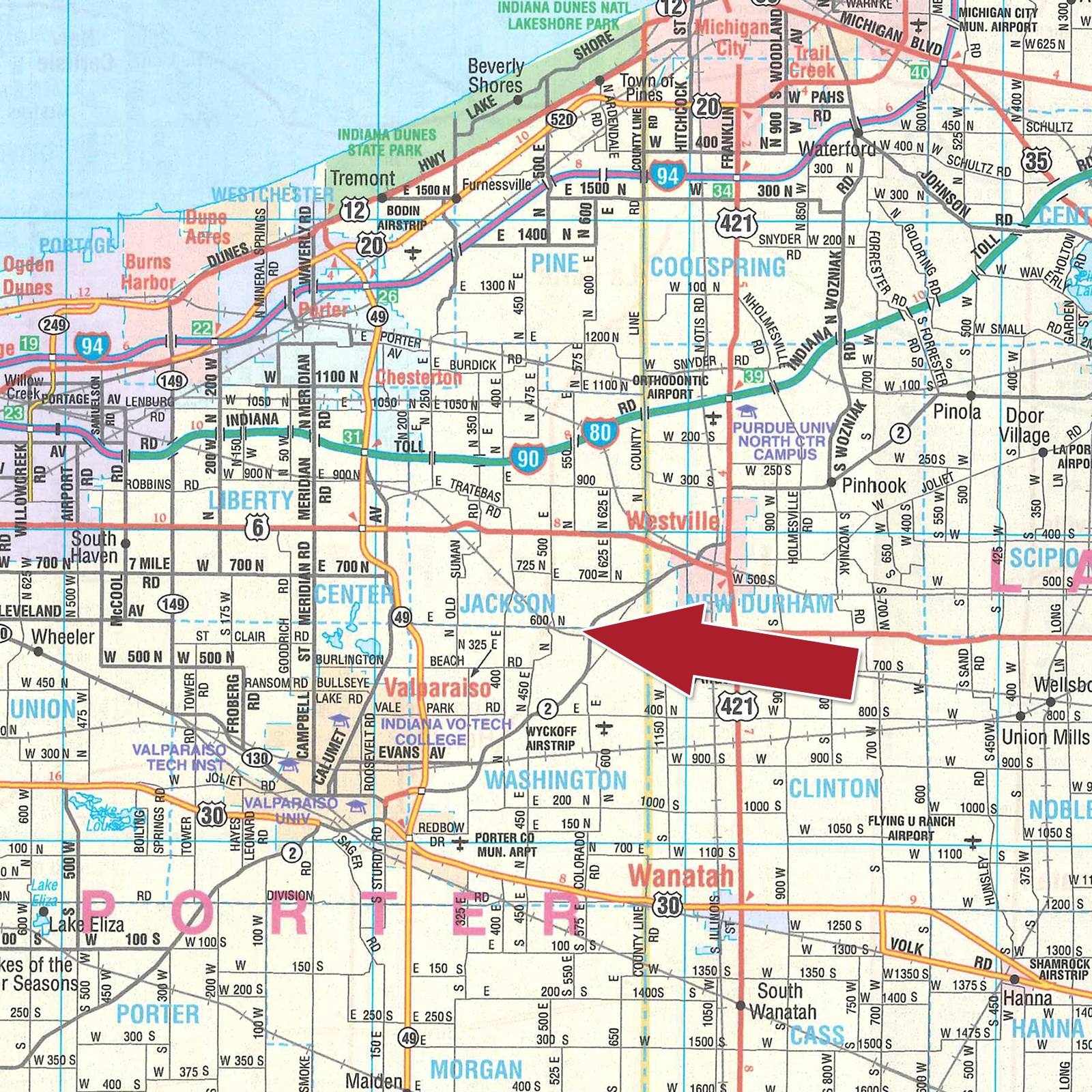 From the east side of Valparaiso at the State Road 49 and State Road 2 interchange, go Northeast on State Road 2 for 5 1/2 miles to CR 600 N. Go West on CR 600 N 0.1 mile to the property on the South side of the road.