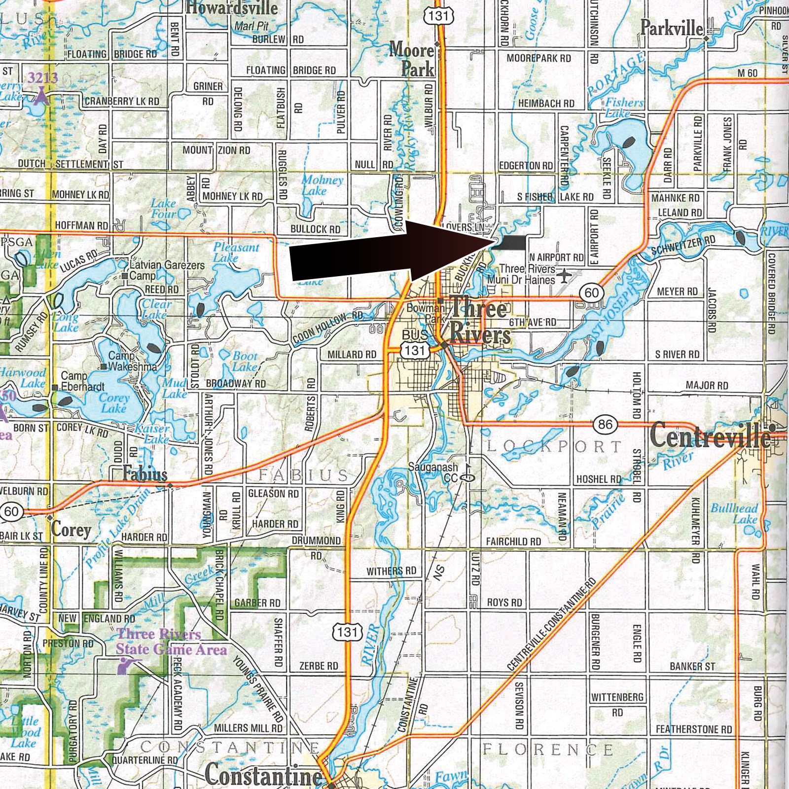 East of Three Rivers on M 60 to Haines Rd. Go North 1 mile to property.