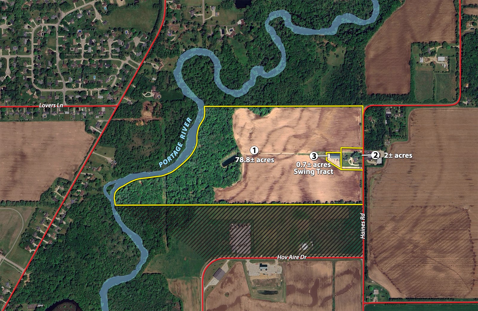 Tract 1: 78.8± ac 49.4 Usda tillable acres, 26+/- acres wooded w/pond. Approx. 1000' frontage on Haines Rd & approx. 1800'+/- on the Portage River. 3 center pivot systems, irrigation well and electric pump.
