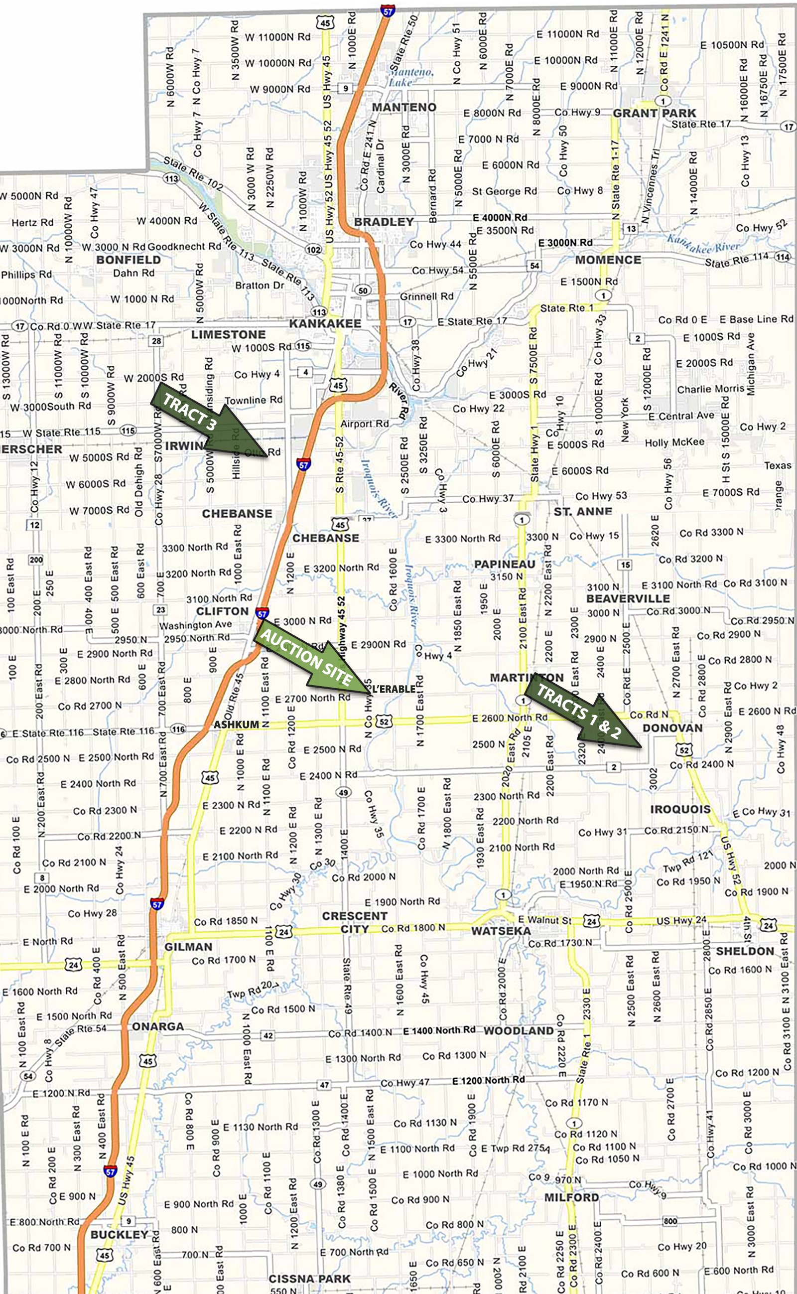 173+/- acres offered in 3 tracts ranging from 33+/- to 100+/- acres in Iroquois and Kankakee County, Illinois.