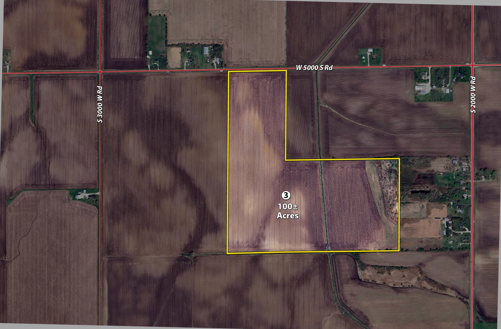 Tract 3: 100± ac Productive farmland and mostly tillable. There are 6.5 acres in CRP that has an annual payment of $226.76/Acre. The CRP contract expires 9-30-2027. Don't overlook the hunting opportunities provided by the wooded area on the east side. Buyer is responsible for any needed improvements to the crossing over the ditch. Frontage on 5000 S Rd.