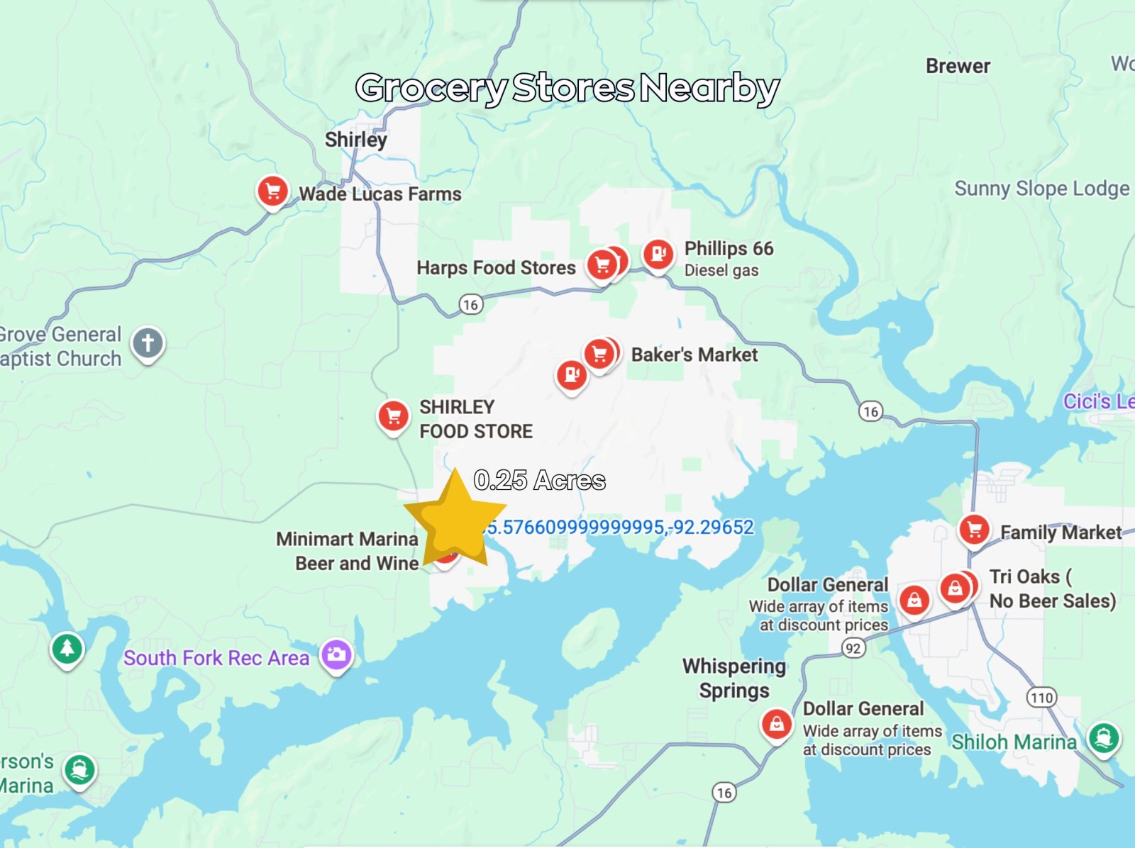 Coordinates, 35.57661, -92.29652.