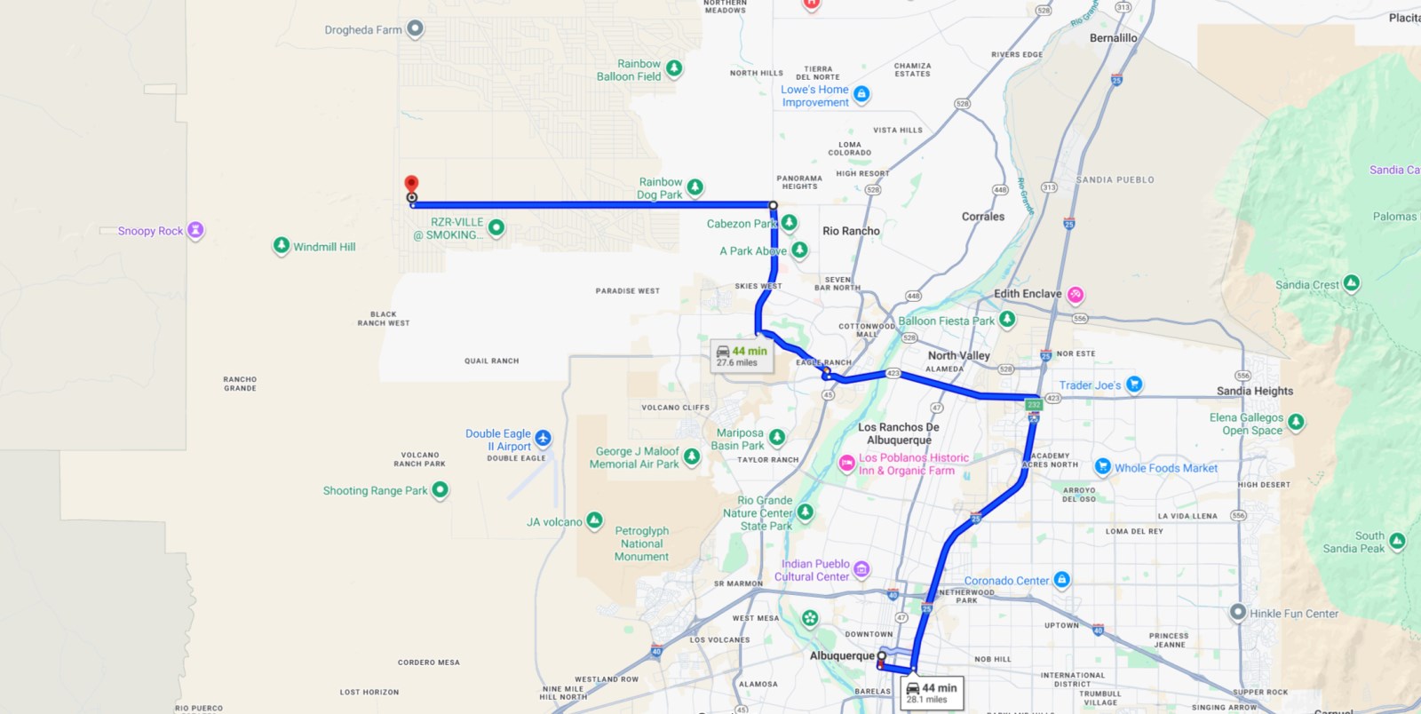 Drive from I-25 N, NM-423 W/Paseo Del Norte Blvd NE, Paradise Blvd NW and Unser Blvd NW to Rio Rancho