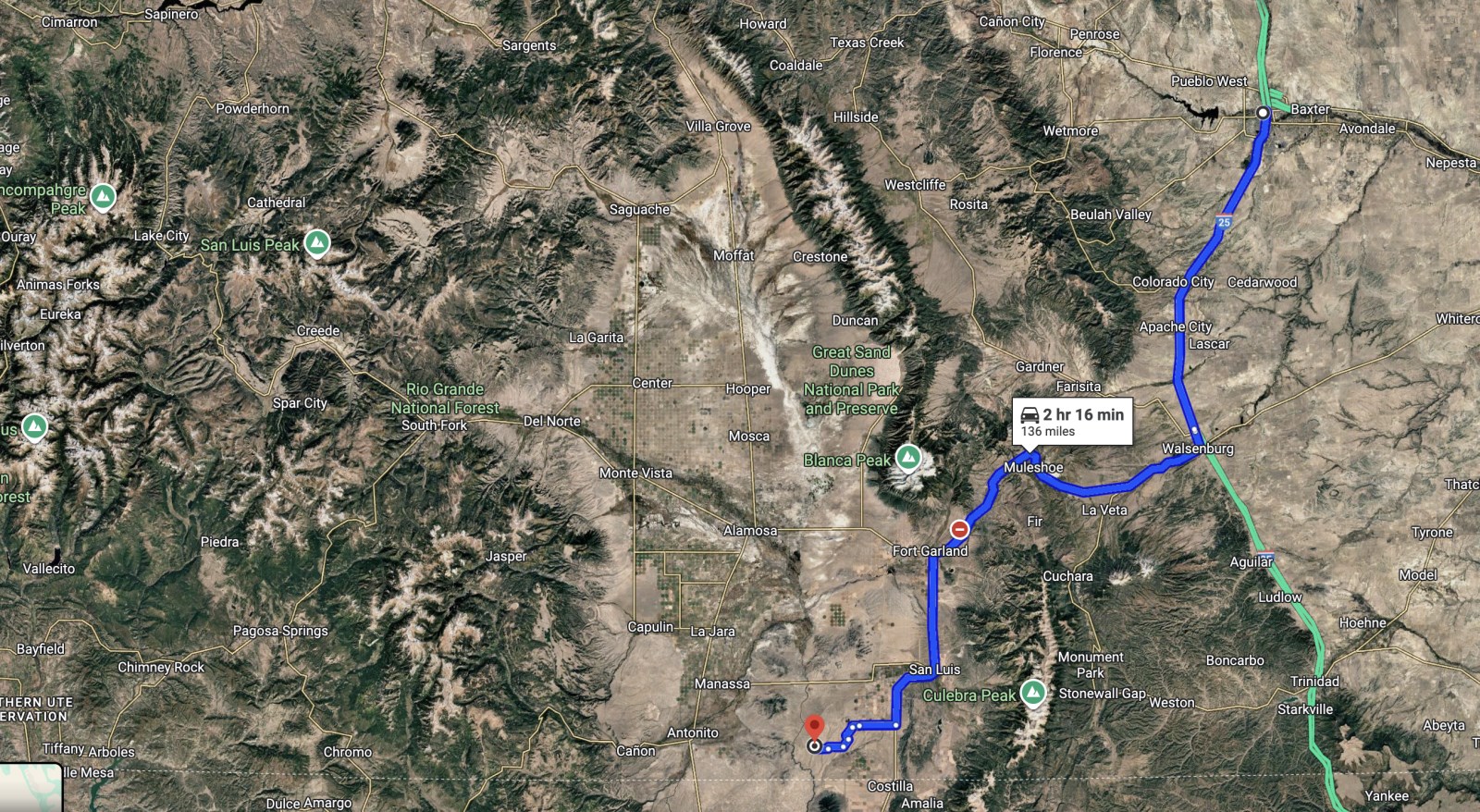 Follow I-25 S and US-160 W to CO-159 S/Miranda Ave in Fort Garland
