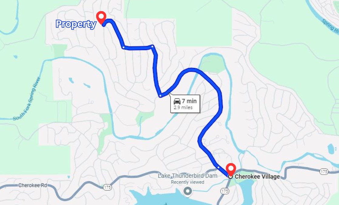 This.43-Acre wooded lot in Cherokee Village is quiet, peaceful, and easy to get to. It sits just off Saratoga Dr. with power and water at the street. The land is flat, clearly marked, and has no HOA with low yearly taxes, making it easy to build a home, cabin, or keep as a getaway spot. You'll be close to outdoor fun like boating, fishing, swimming, hiking, and trail riding. Lakes like Crown Lake and Lake Thunderbird are just minutes away, and there are two golf courses nearby as well. Spring River and local parks offer more places to explore and relax. The community also has pools, tennis and pickleball courts, camping areas, and RV spots. Dollar General is 3.4 miles away, Lake Thunderbird is 3.2 miles away, and South Fork Spring River is 1.2 miles away. This is a great place if you want nature, space, and quiet time. Take it home for just $75/Month. Call or text to make it yours.