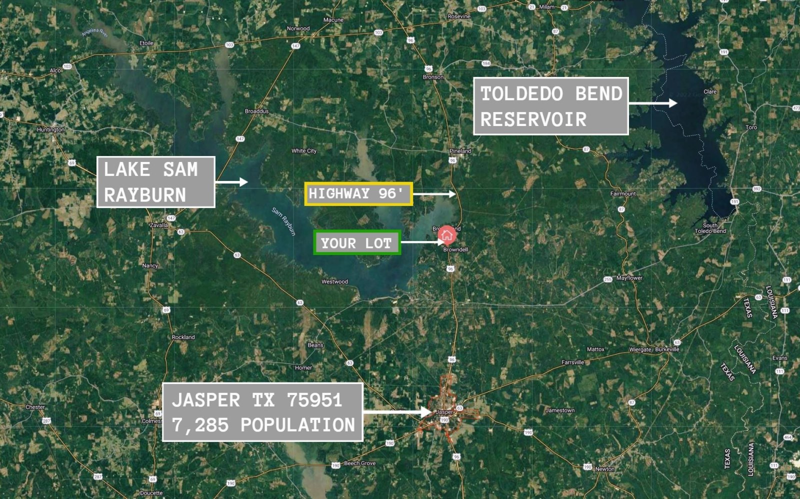 Brookeland is in Jasper County, Texas and is located about 150 miles northeast of Houston, Texas. Brookeland is just minutes to the Sam Rayburn Lake, which is the largest lake in Texas. Lake Sam Rayburn is comfortably located approximately halfway between the cities of Beaumont and Longview and runs 79 miles long. Lake Sam Rayburn was named the No. 1 bass fishing lake in the United States in 2018.