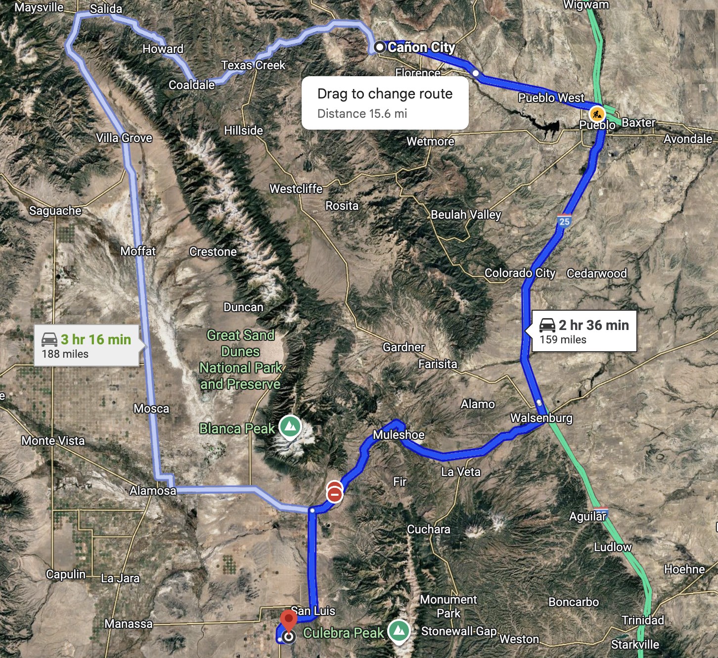 Follow US-50 E, I-25 S and US-160 W to CO-159 S/Miranda Ave in Fort Garland