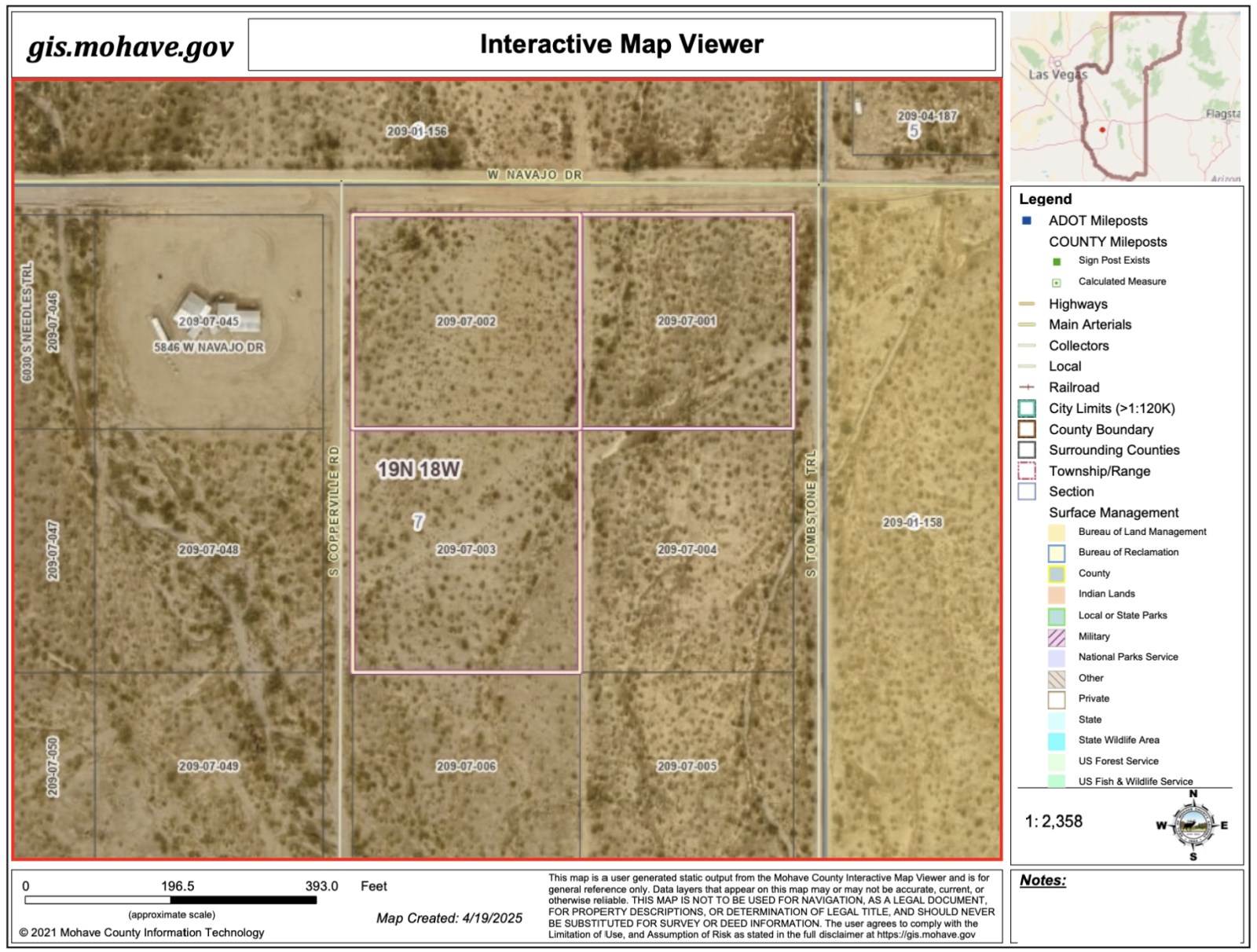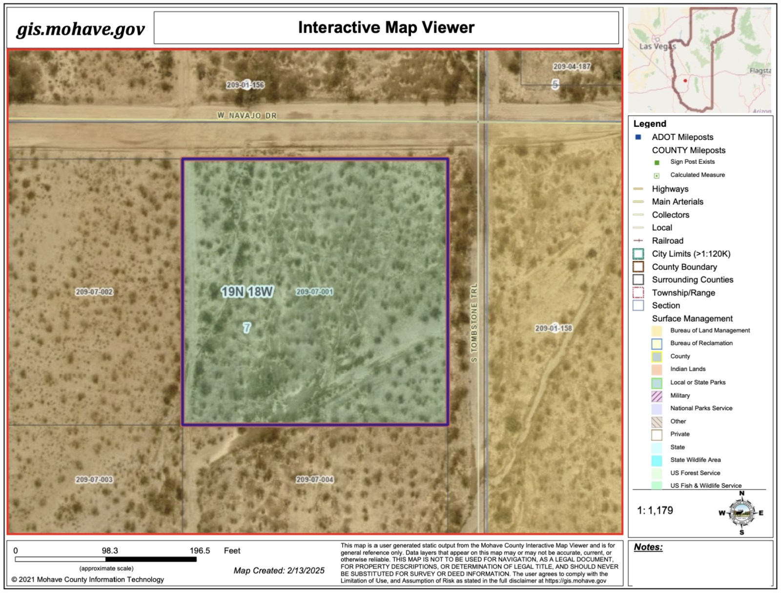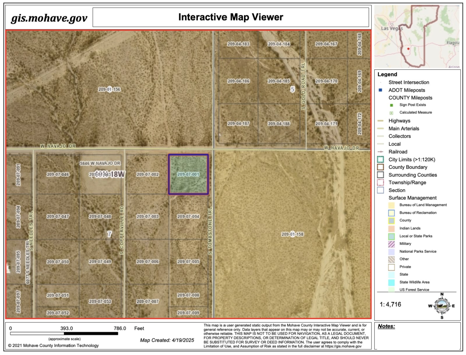 This spacious 1.93-Acre corner lot in Mohave, AZ, is situated on a flat, level terrain with easy access via well-maintained roads. It provides the perfect location for building your dream home, parking your RV, or setting up a mobile home. The lot borders 850 acres of vacant federal land. Power is on Navajo Road, just half a block from a neighboring house, and phone access is also available on Navajo.