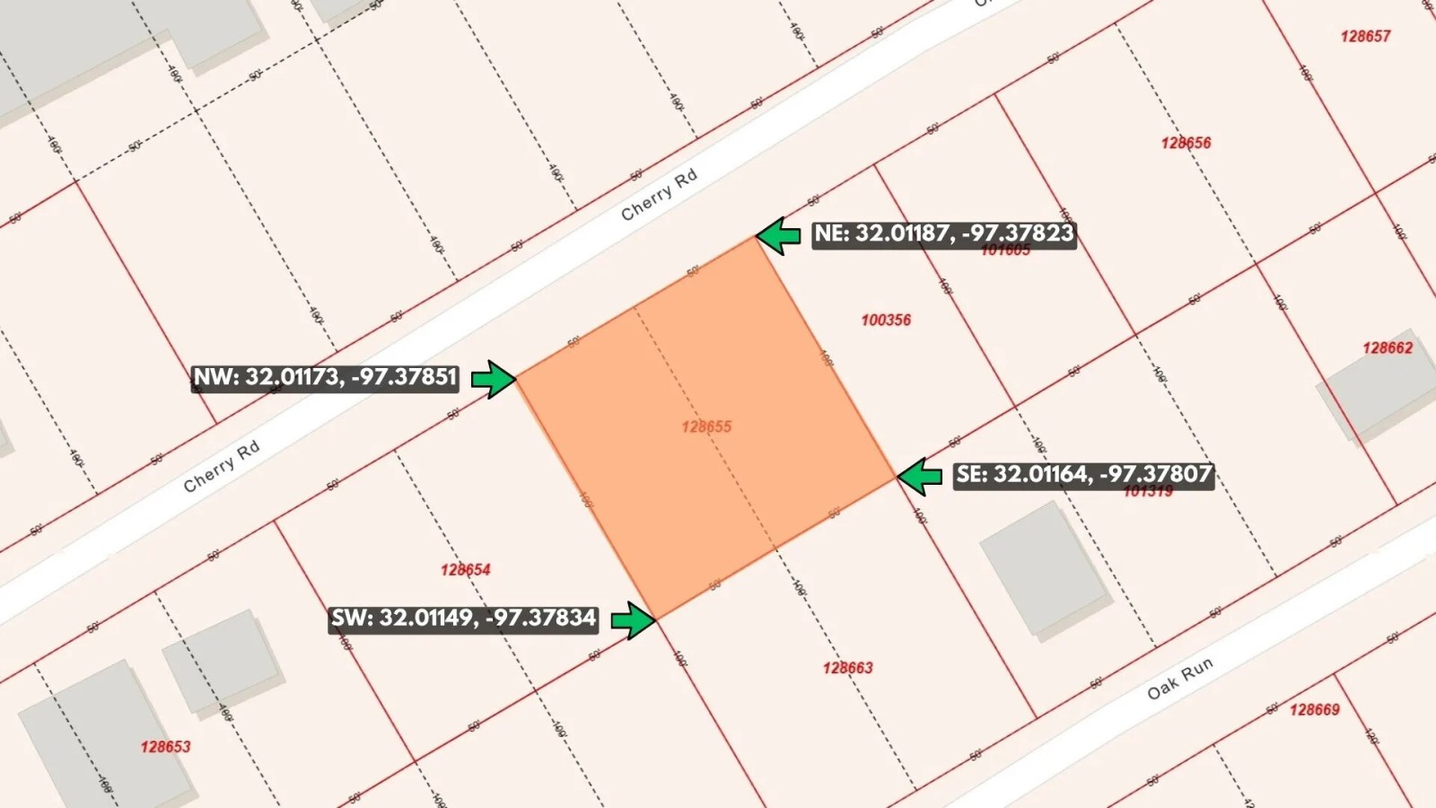 To visit this 0.23 Acres Double Lot near Lake Whitney, TX for sale, search Lots 734-735 Cherry Rd, Whitney, Texas, 76692 within Hill County on any mapping app. When you are near the land, search “32.01173, -97.37851” on navigation app to locate one of the corners.