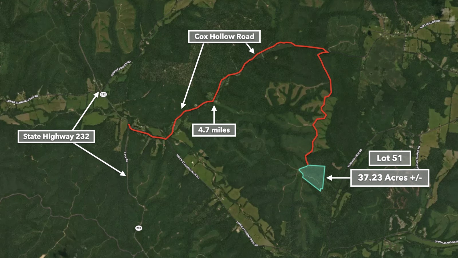 Entrance to Freedom Ridge Dover off of Cox Hollow Road: 36.447136, -87.926770