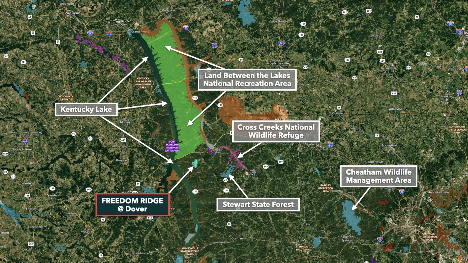 Freedom Ridge Dover is ideally situated between Kentucky Lake and Lake Barkley, while also being less than 3 miles from the South boundary of the 170,000 Acre Land Between the Lakes National Recreation Area.