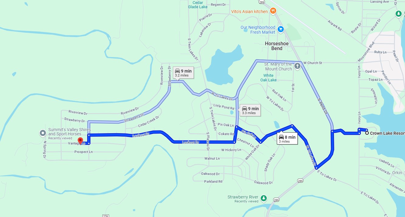 Continue on AR-289 N/S Bend Dr. Take Lookout Dr to Vantage Lane in Horseshoe Bend