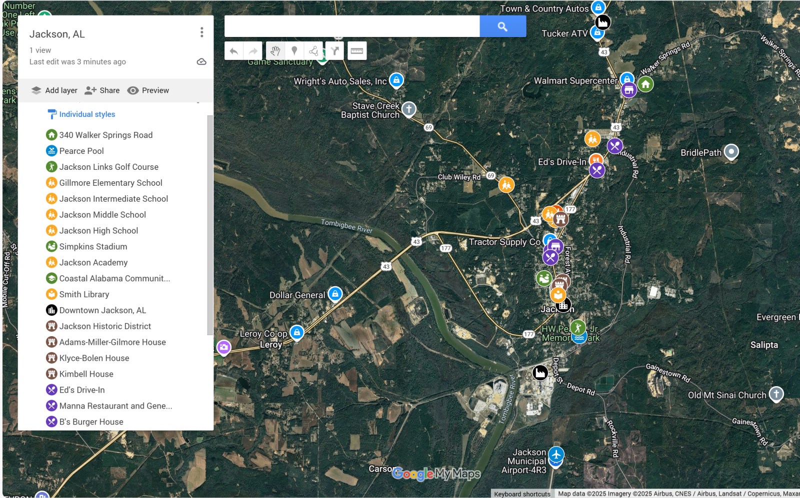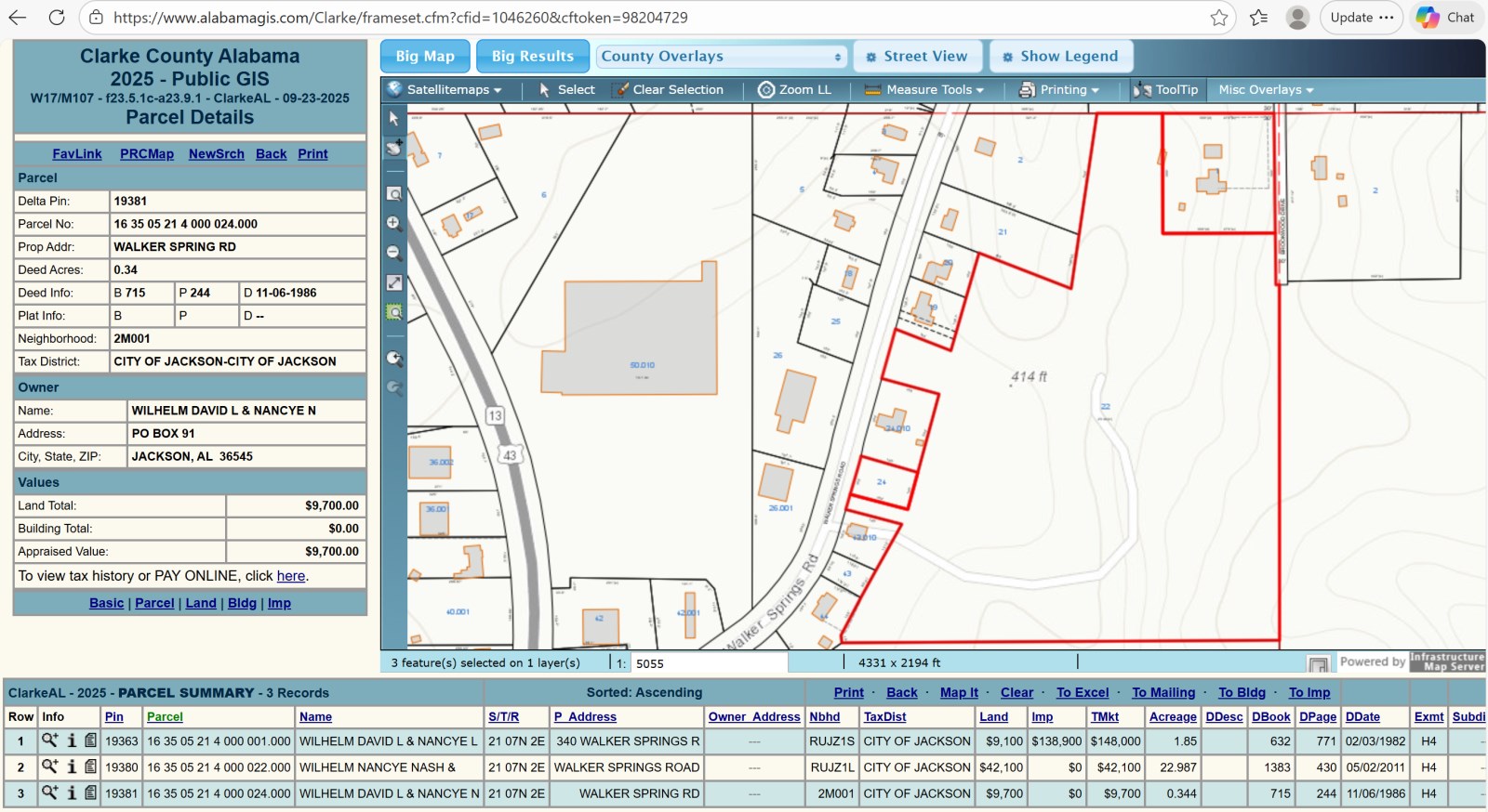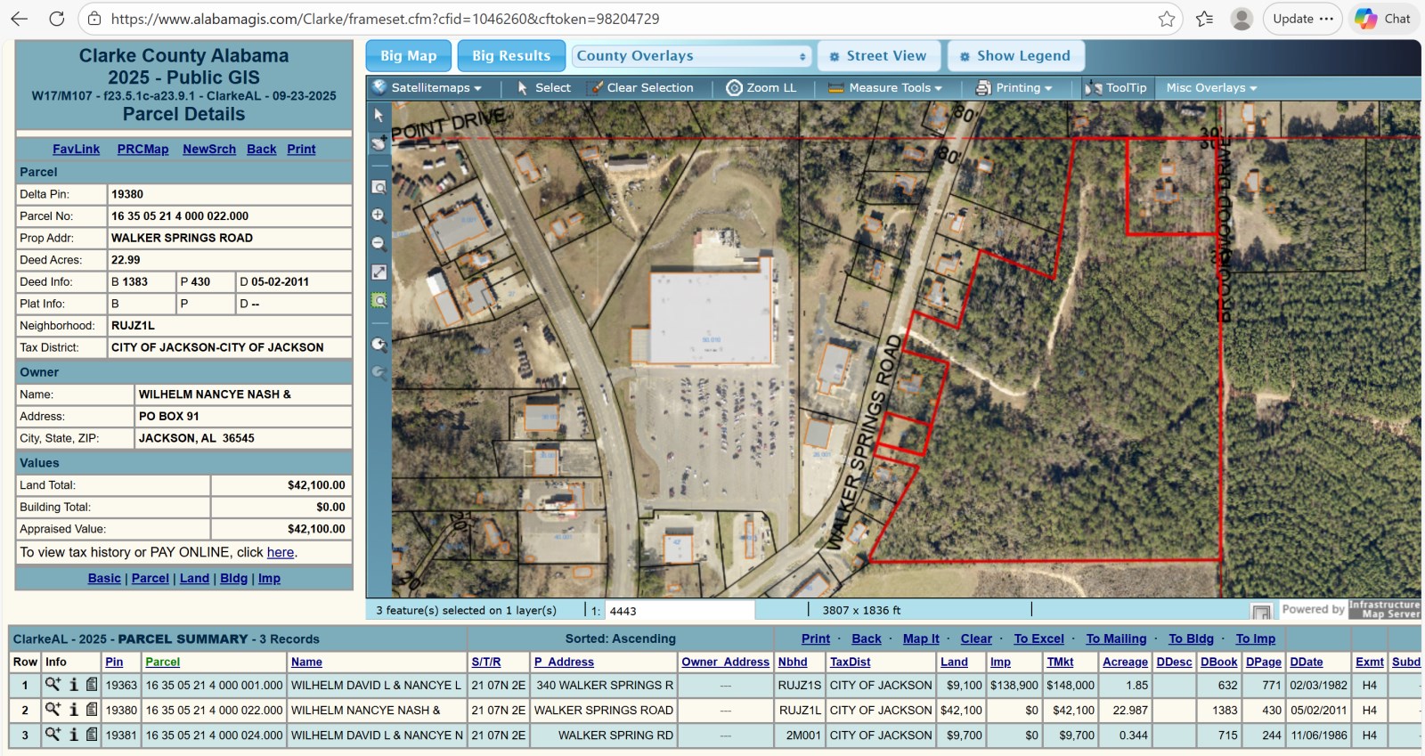 Travel on US Highway 43 to Jackson, AL. Turn onto Walker Springs Road at the traffic signal/light next to the Walmart. Travel down Walker Springs Road only a quarter of a mile. Look for a green "340 Walker Springs Road" sign next to a private gravel road on the right immediately after Alabama Career Center System and Fresenius Kidney Care Tombigbee (these buildings are opposite on the left side of the road). Proceed down the gravel road a quarter of a mile to the house and other buildings on the property. Observe much of the property on both sides of the road as you travel down the gravel road. Be sure to coordinate with Julia Brooks at Village Properties prior to entering the gravel road and property.