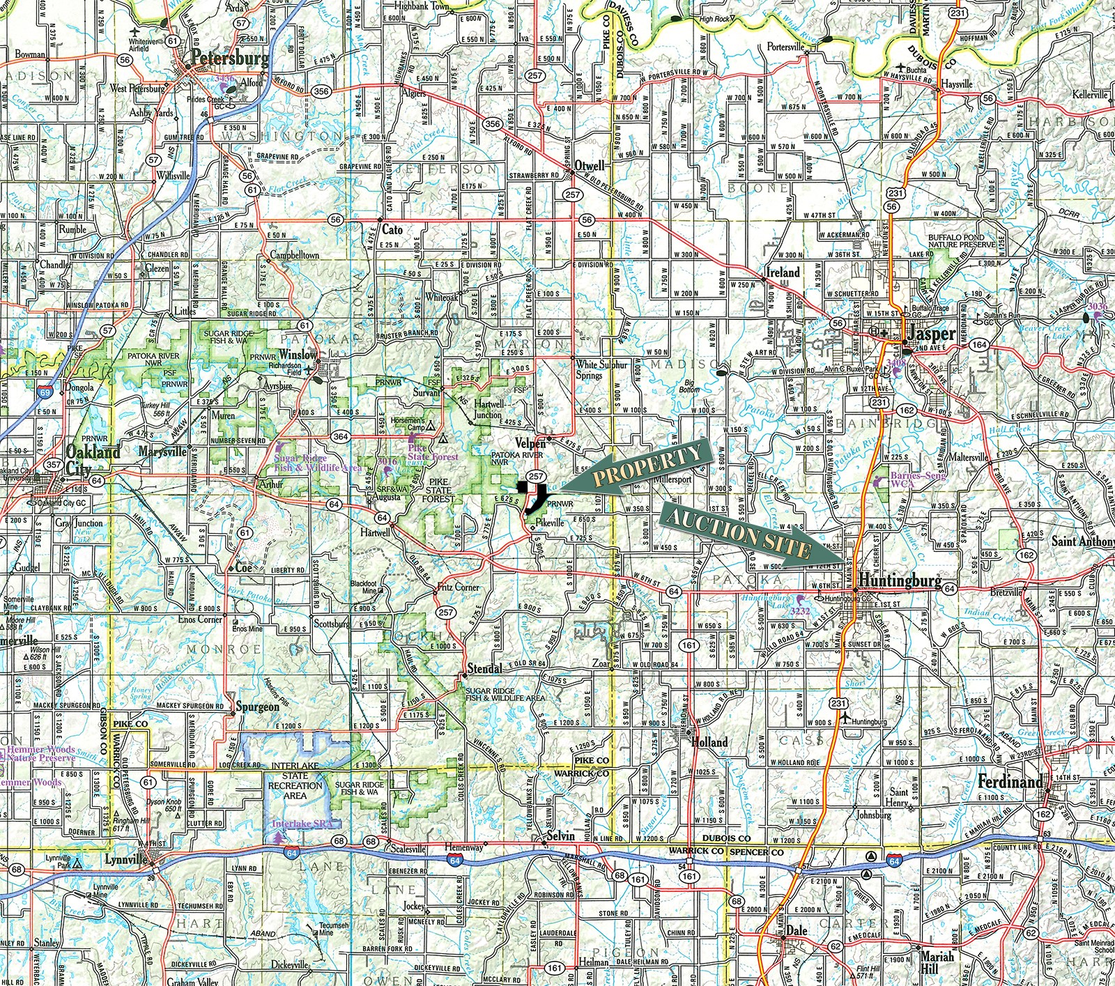 From the junction of US Hwy 231 (Main St) & St Rd 64 (6th Street) in downtown Huntingburg, go West on St Rd 64 10 miles to St Rd 257, turn North & proceed 2.8 miles to the property.