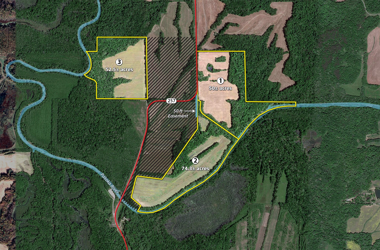 Tract 3: 52.5± ac with 27+/- tillable acres, the balance is in woods & adjoins the Patoka River National Wildlife Refuge.