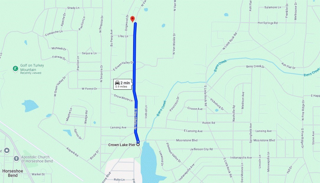 Crown Lake Pier, 820 Pearl Dr, Horseshoe Bend, AR 72512 (2 min, 1 mile)