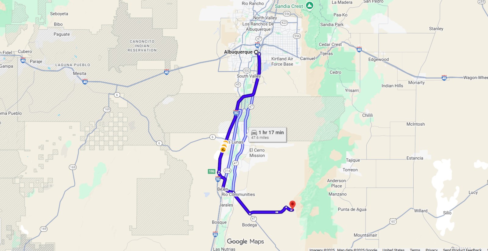 Follow I-25 S to I-25BL in Belen. Take exit 195 from I-25 S