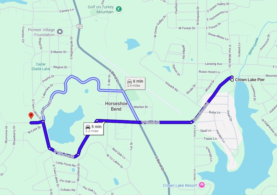 Follow AR-56 E for about 5 miles until you reach Horseshoe Bend.