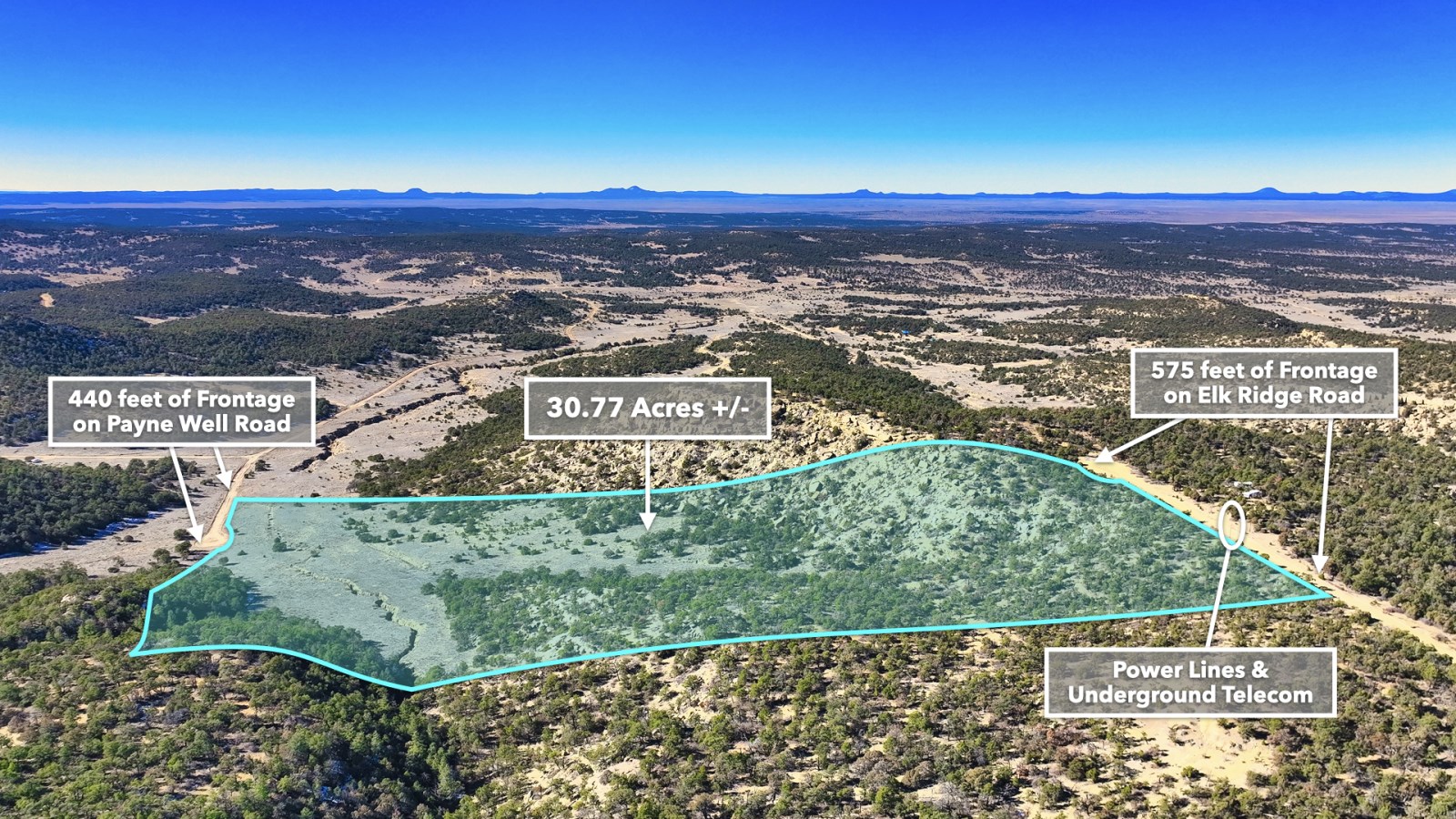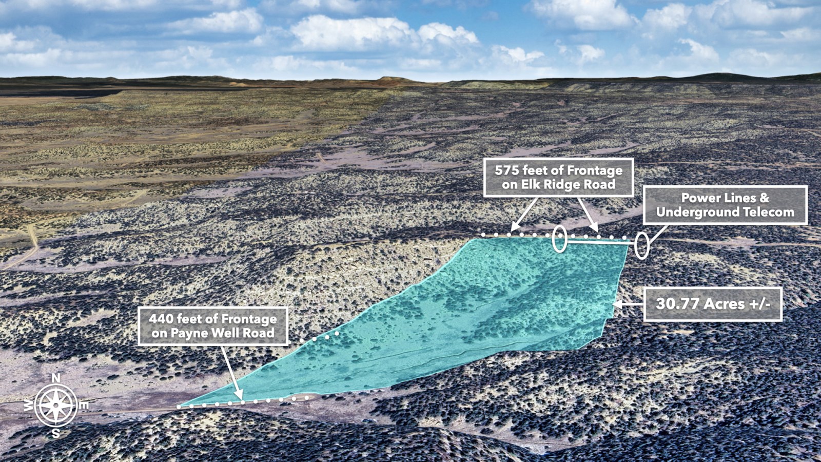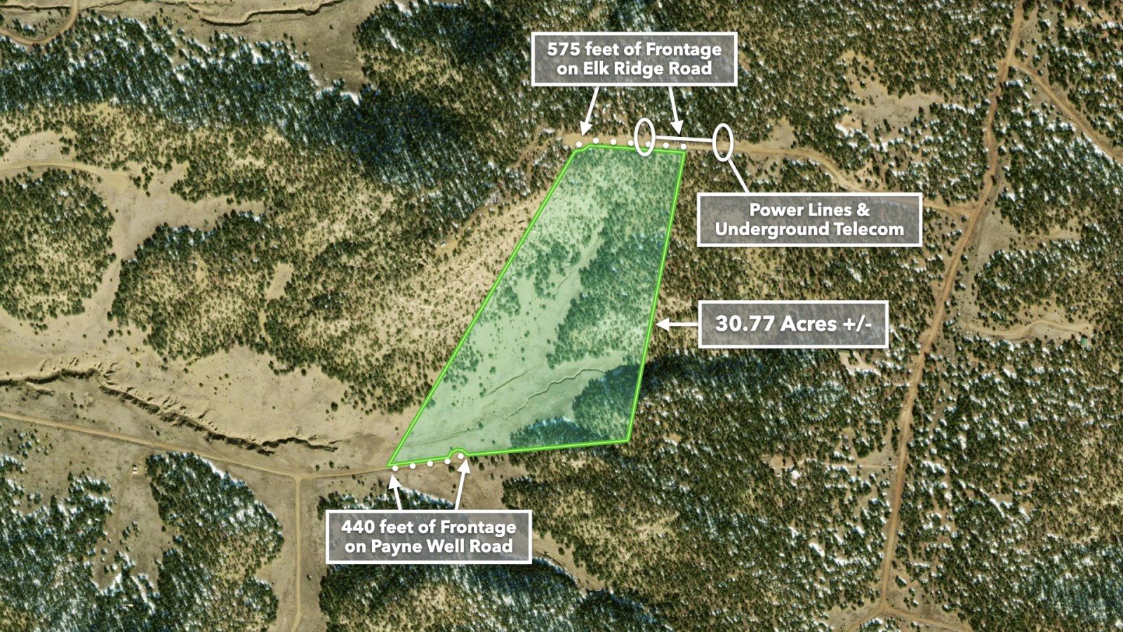 • 575 feet of frontage along Elk Ridge Road on the northern boundary, where power lines are already in place
