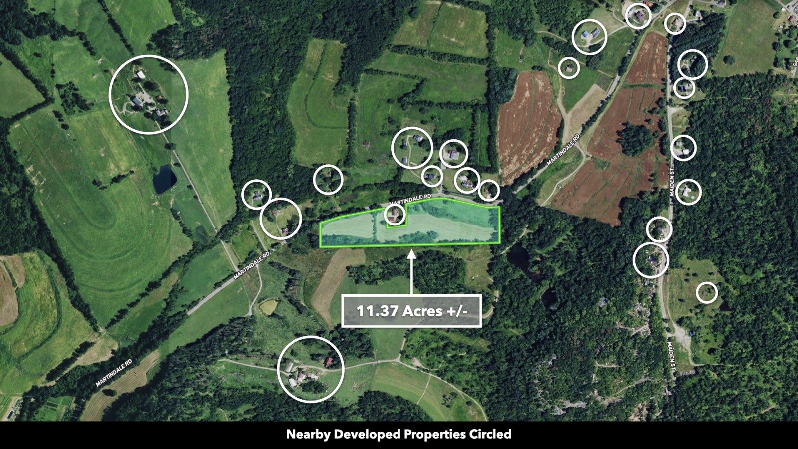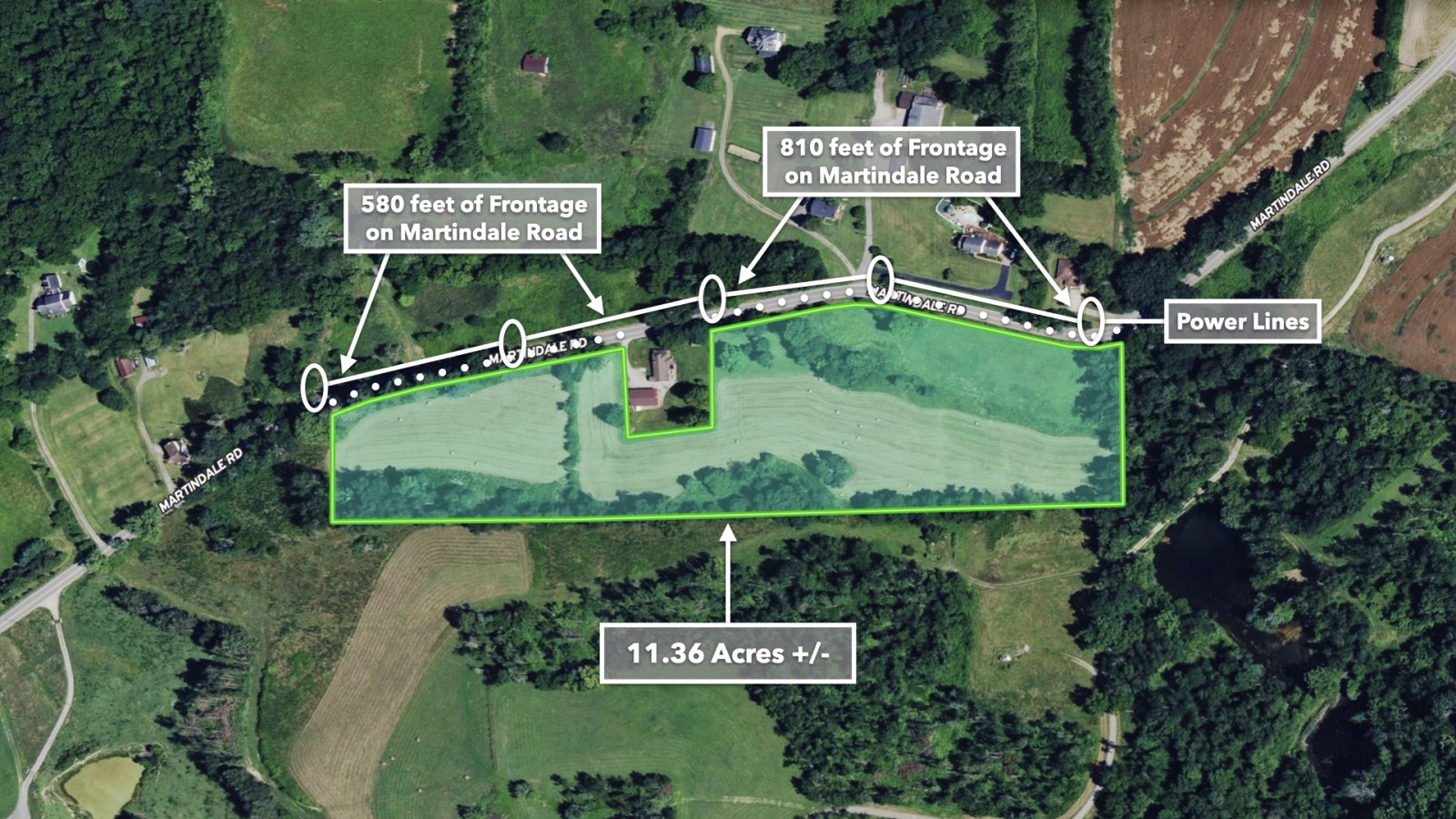 The land rolls along Martindale Road with an impressive 1,390 feet of total road frontage along the northern boundary-approximately 580 feet on the western portion and 810 feet on the eastern portion.