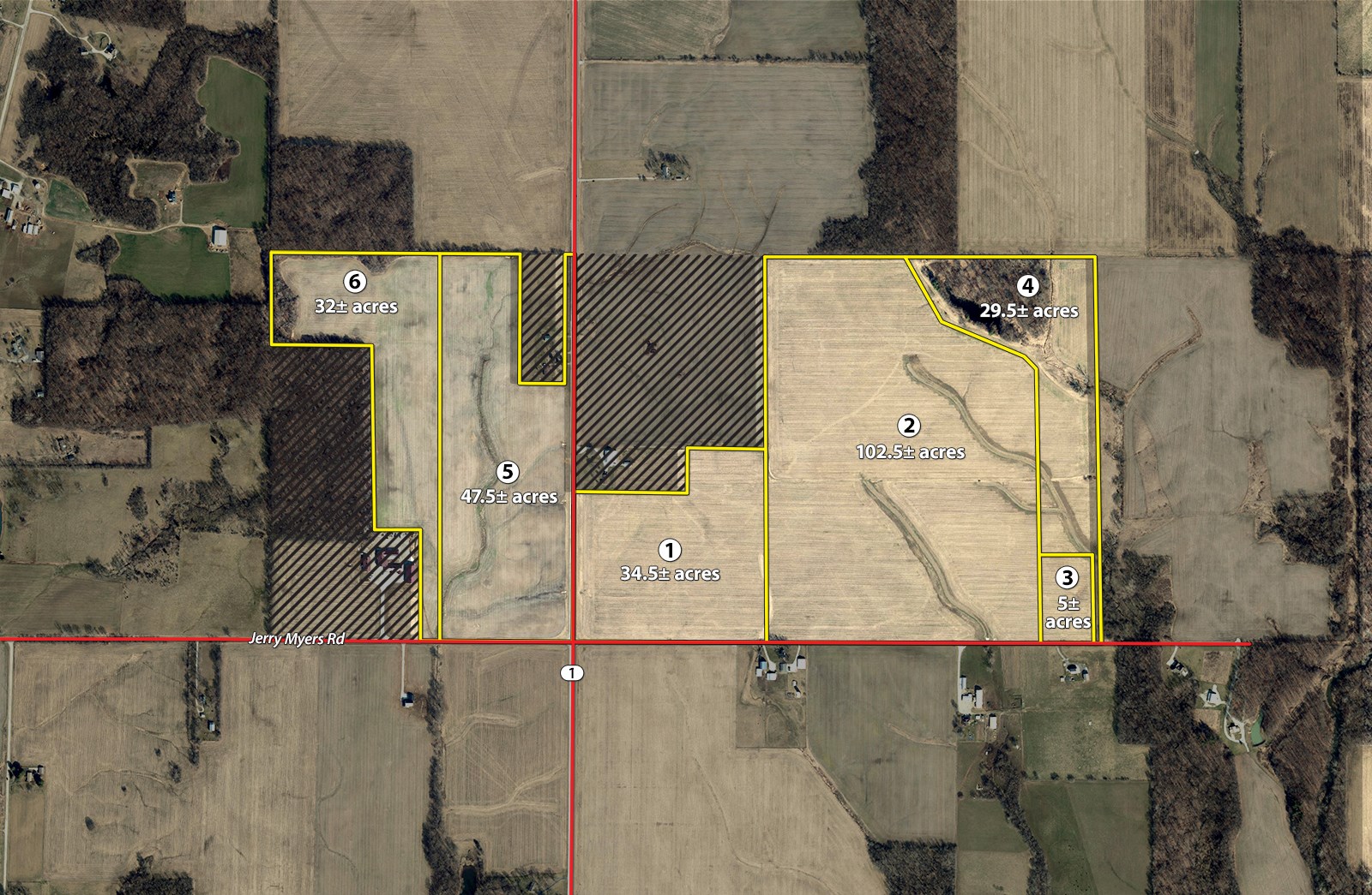 Tract 6: 32± ac nearly all tillable with tree-lined borders along the northwest boundary. 150' of frontage on Jerry Myers Rd. Quality soils throughout. Consider combining with Tract 5.