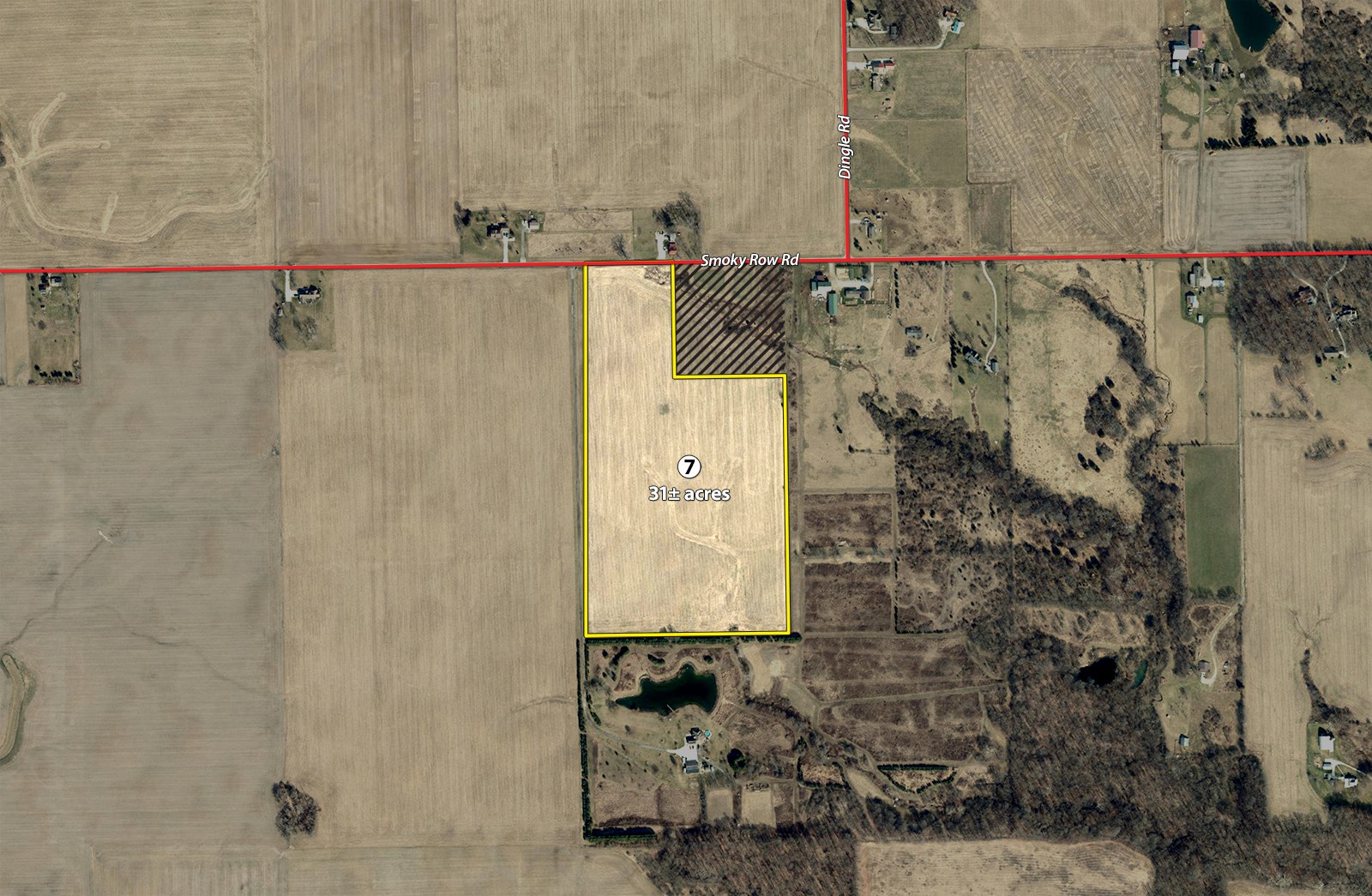 Tract 7: 31± ac nearly all tillable. This property is gently rolling and features Miami, Treaty, and Strawn soils. Frontage on Smoky Row Rd.