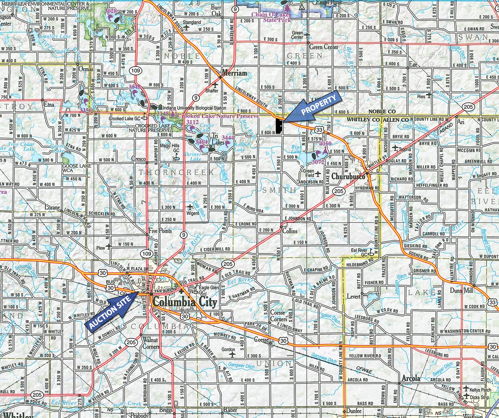 Approximately 3 miles northwest of Churubusco, IN on US 33 to CR 550E, then just south to the property OR approximately 3 miles Southeast of SR 9 & US 33 at Merriam on US 33 to CR 550E.