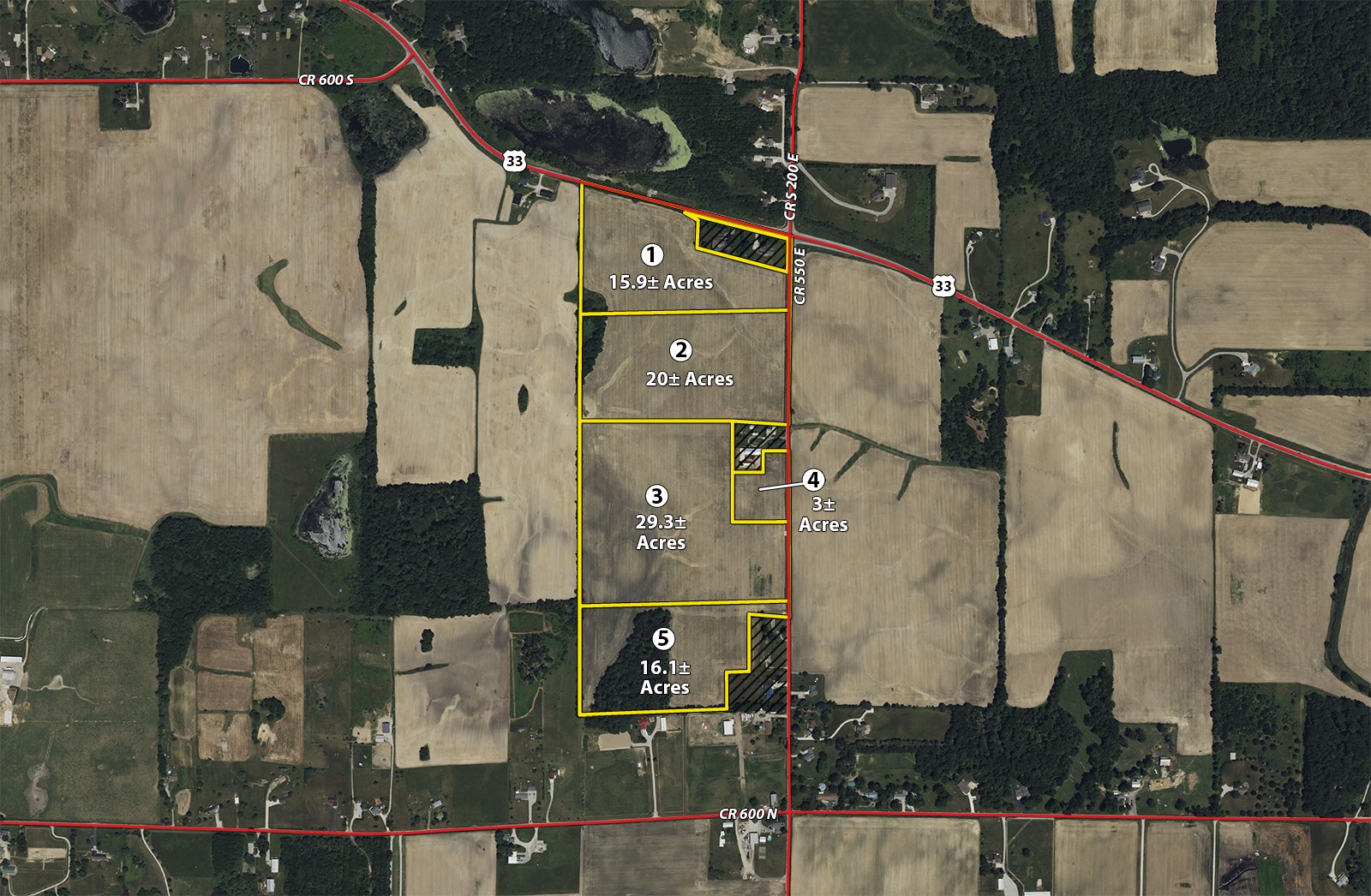 Tract 1: 15.9± ac with frontage on US 33 & CR 550E. This tract is mostly all tillable. Great location for your mini farm and all your hobbies.