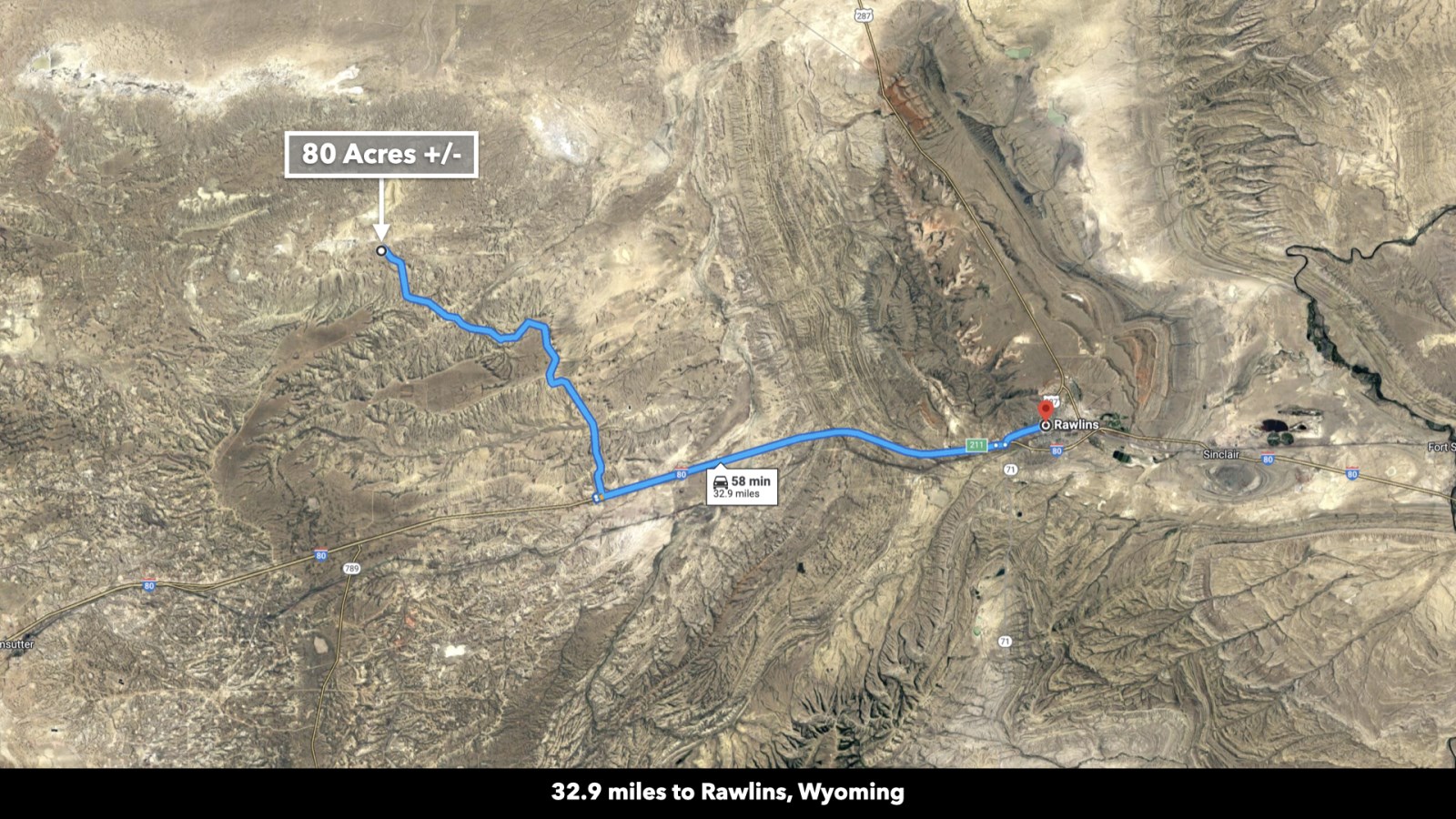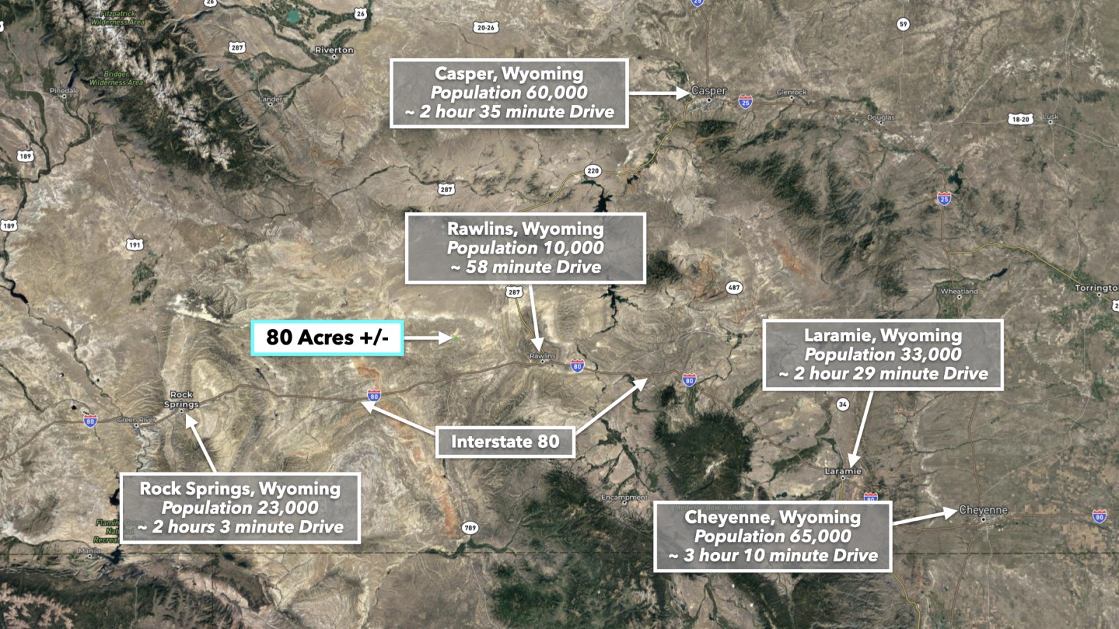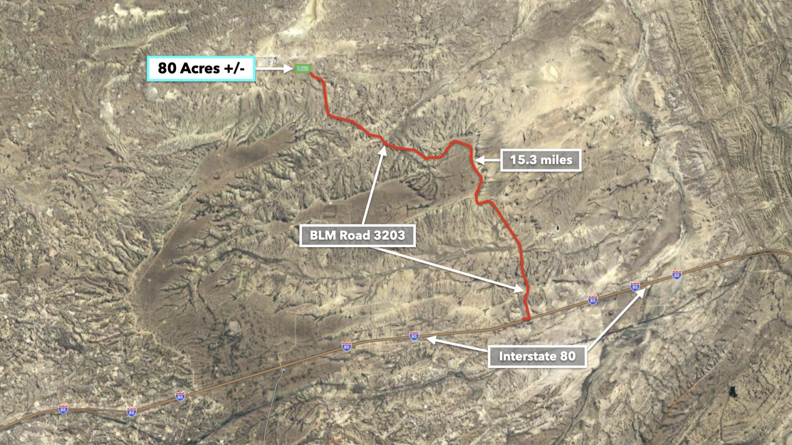 The property has 0.3 miles of road access along BLM Road 3203 which connects to I-80 15.3 miles to the south. Take the interstate west into Rock Springs or east into Rawlins. Both cities have restaurants, grocers, and professional and medical services available.