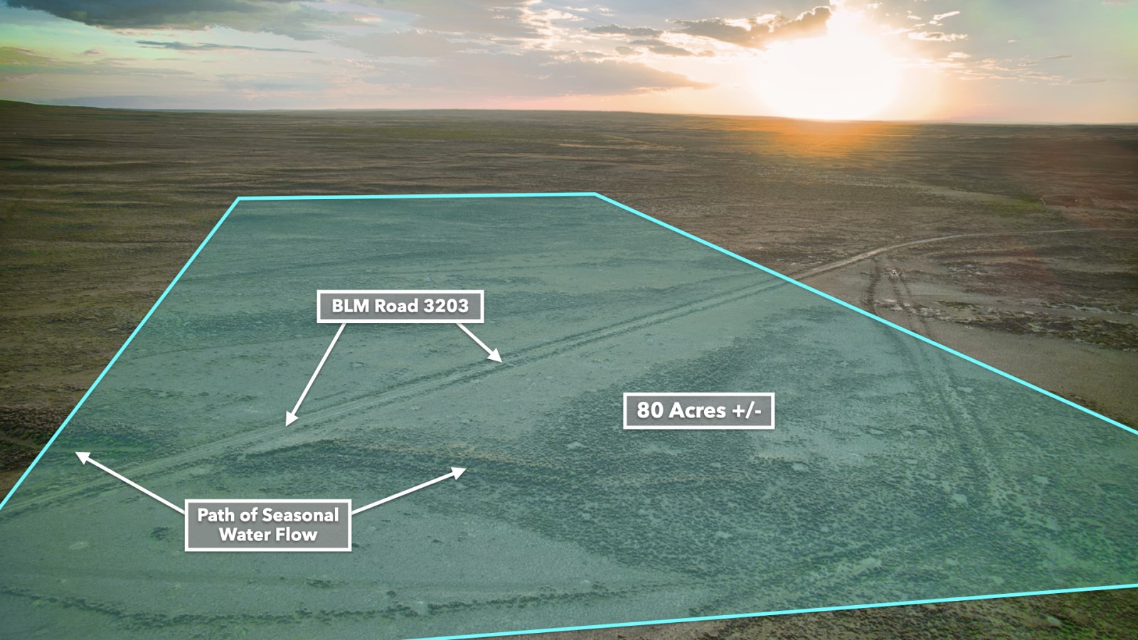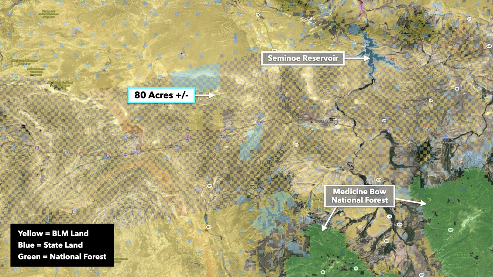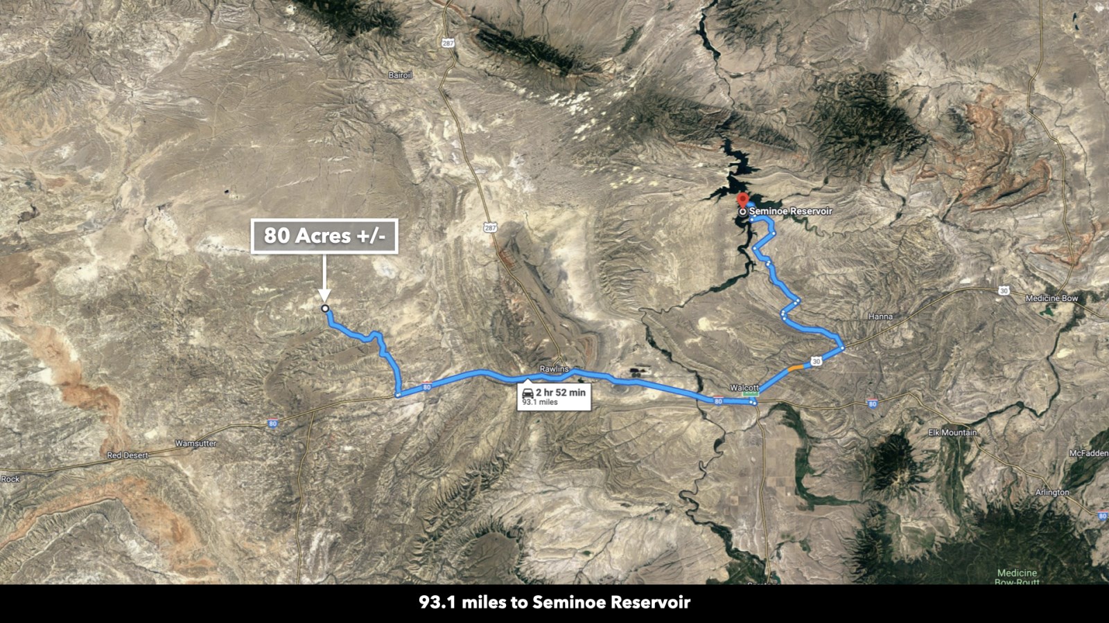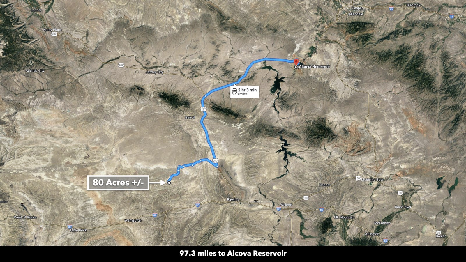 The property has 0.3 miles of road access along BLM Road 3203 which connects to I-80 15.3 miles to the south. Take the interstate west into Rock Springs or east into Rawlins. Both cities have restaurants, grocers, and professional and medical services available.